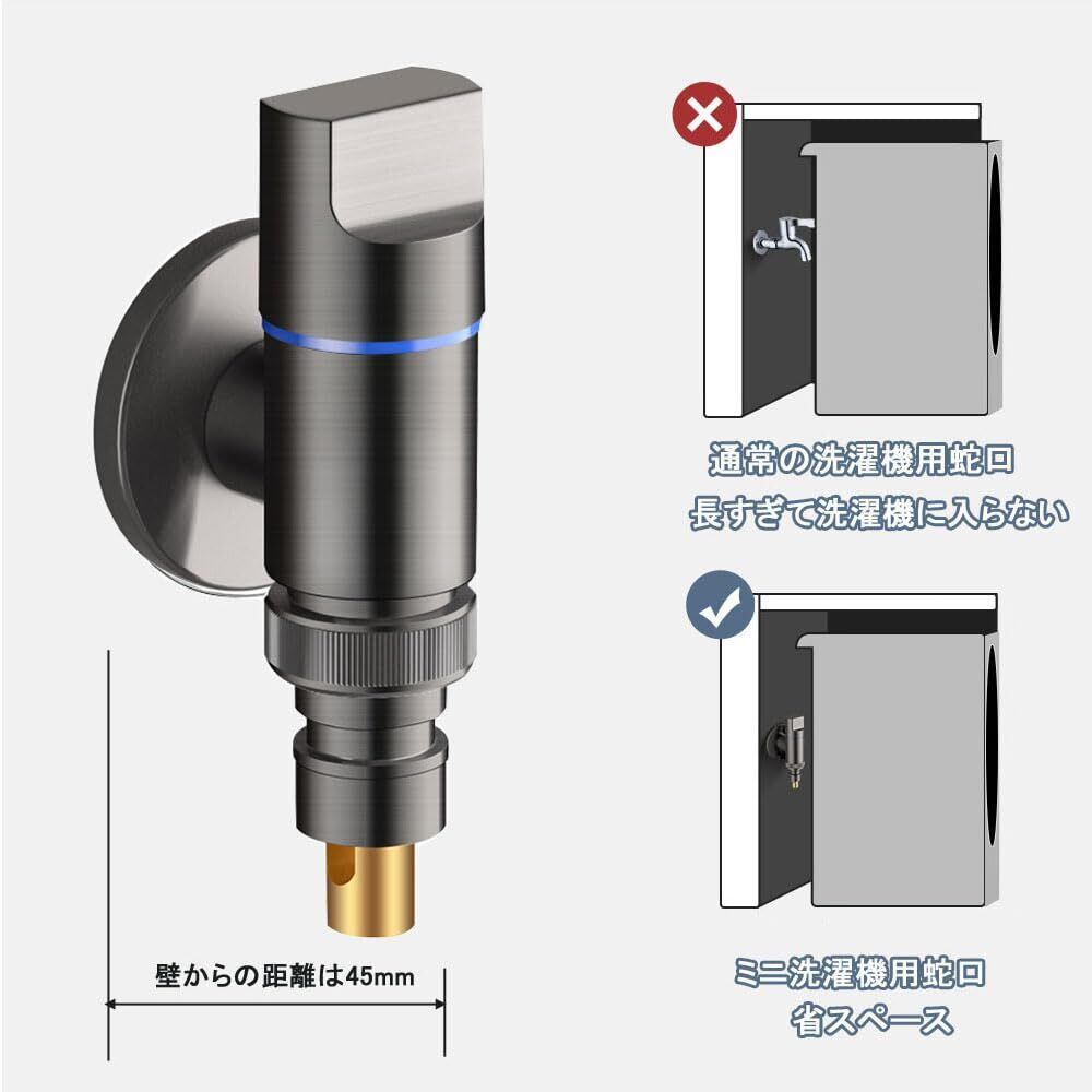 【ミニ蛇口、大きな助け】この蛇口は長さ約100mm、直径25mm、深さ48mmです。取り付け後、壁からの距離は45mm。洗濯機のスペースを占有せず、狭いスペースでもスムーズに設置できます。