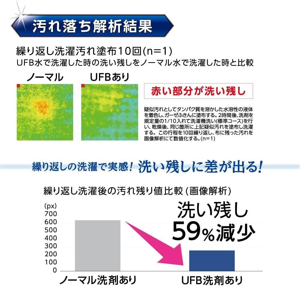 【繰り返しの洗濯で実感!洗い残しに差が出る。】ノーマル水での洗濯に比べ、ウルトラファインバブル水は59%洗い残し減!※疑似汚れとしてタンパク質を溶かした水溶性の液体を着色し、ガーゼふきんに塗布。2時間後、洗剤を規定量の1/10入れて洗濯機洗い(標準コース)を行い、乾燥後、同じ箇所に上記疑似汚れを塗布し洗濯。この工程を10回繰り返し、布に残った汚れを画像解析にて数値化し検証。