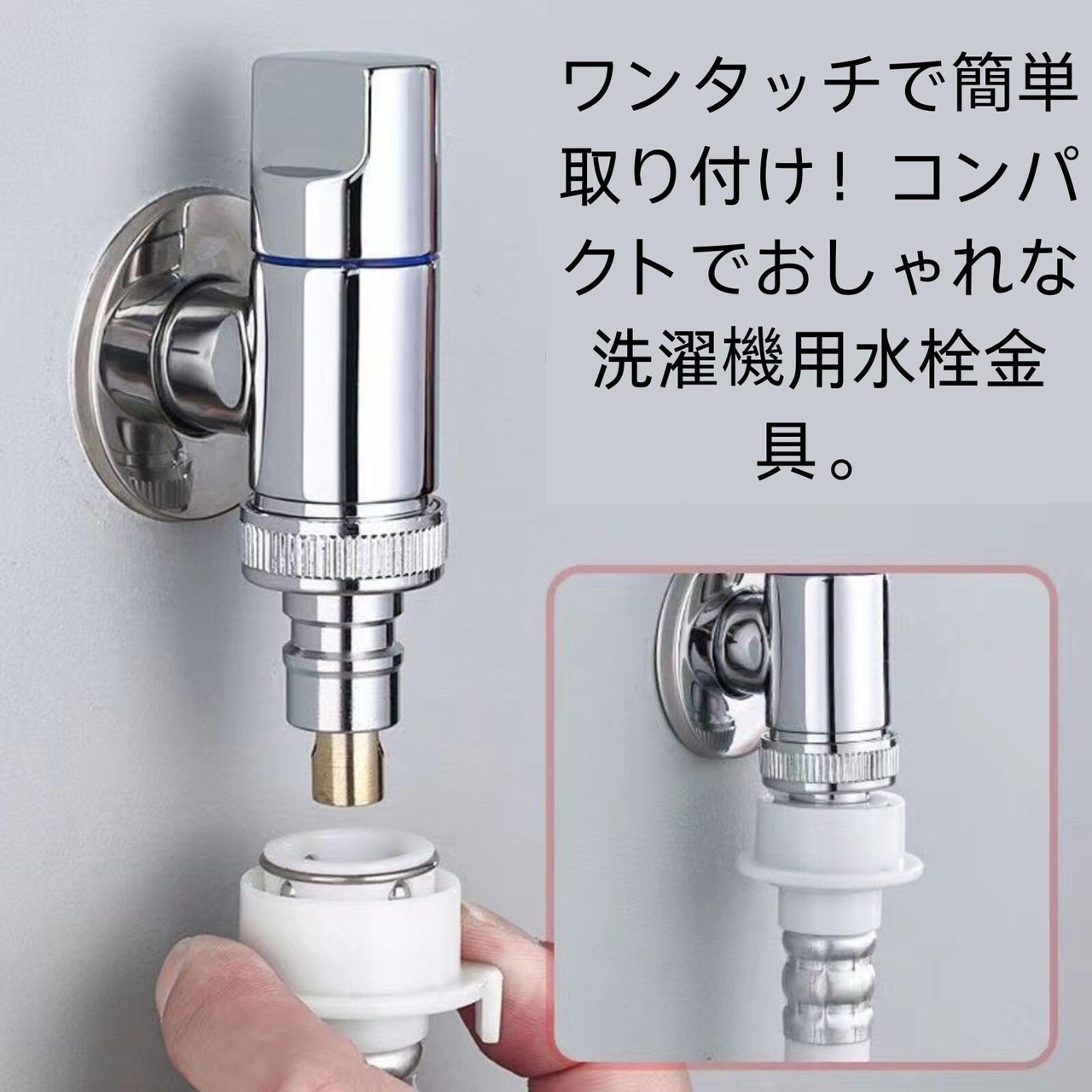 ワンタッチで簡単取り付け!コンパクトでおしゃれな洗濯機用水栓金具。オートストッパー搭載で万が一の水漏れも安心。