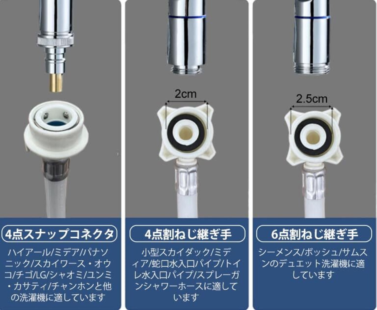 【ほとんどの家庭に対応】4分/6分規格の一般家庭用配管に適合。ワンタッチ着脱式で洗濯機ホースの交換も楽々。※シールテープカラーはお任せとなります。