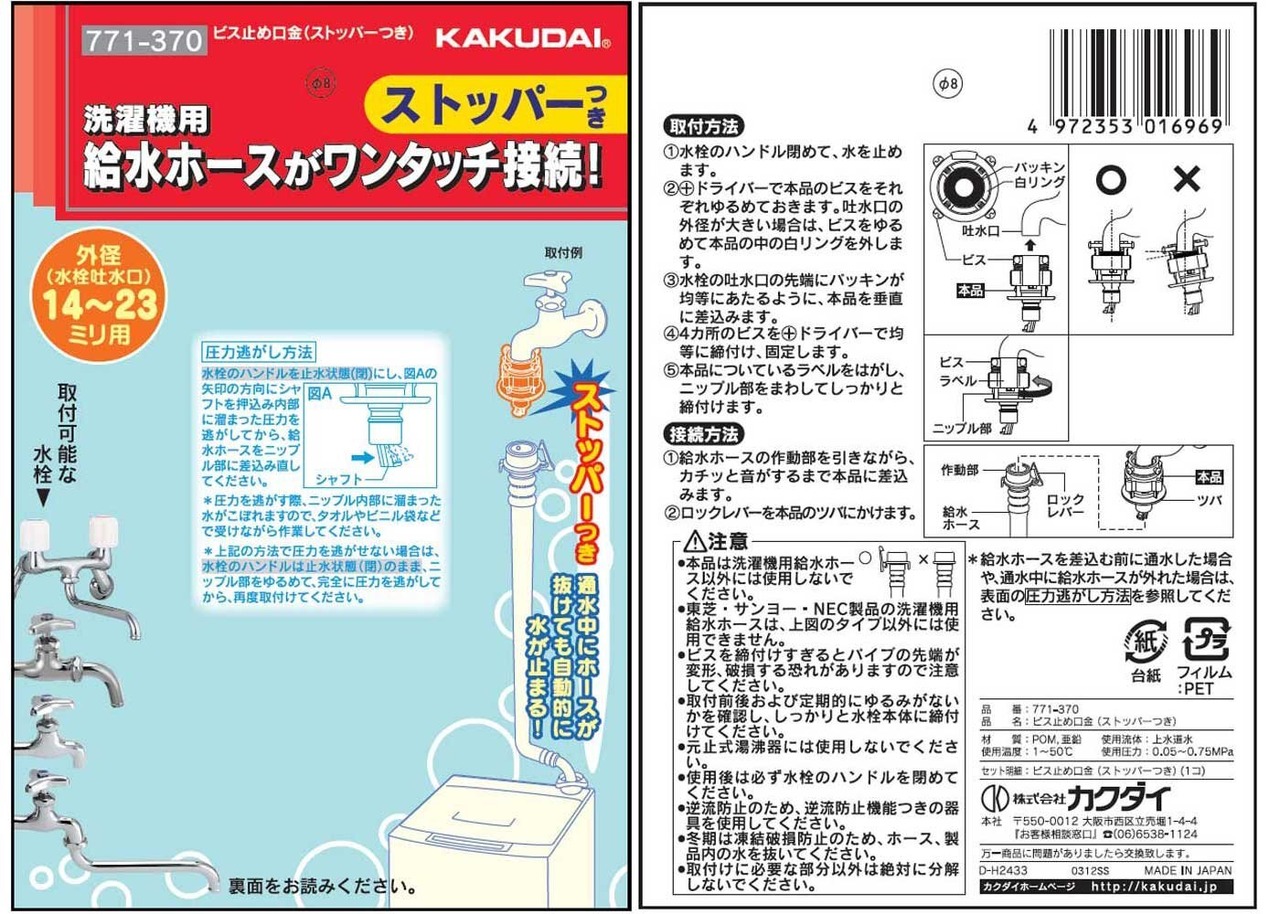 【限定セール】カクダイ 洗濯機用 取付簡単ニップル ビス止め式 給水ホースをワンタッチ接続 水漏れ防止ストッパー付き 樹脂製 771-370