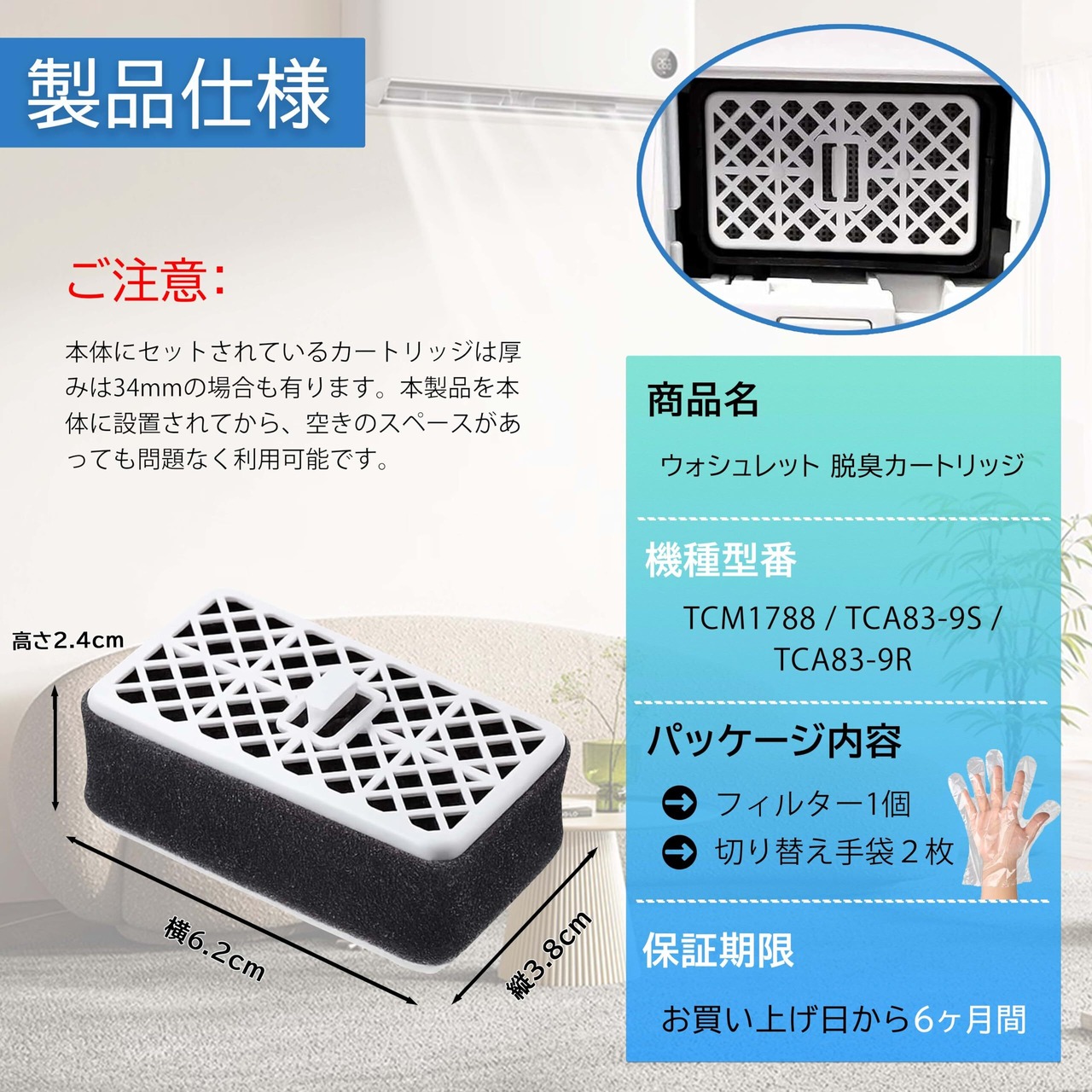 【製品仕様】 ❶型番:TCM1788 / TCA83-9S / TCA83-9R ❷パッケージ内容:toto ウォシュレットに適合する 触媒組品1個 ❸寸法:幅38mm*横62mm*高さ24mm(通常のまま設置して空きのスペースがあっても問題なくご利用ください。) ) ❹ご注意:本製品はtoto用 ウォシュレット 脱臭 カートリッジ 純正品ではなく、互換品です。