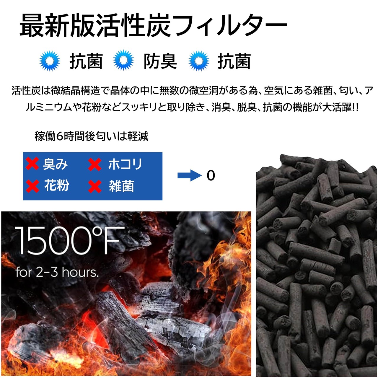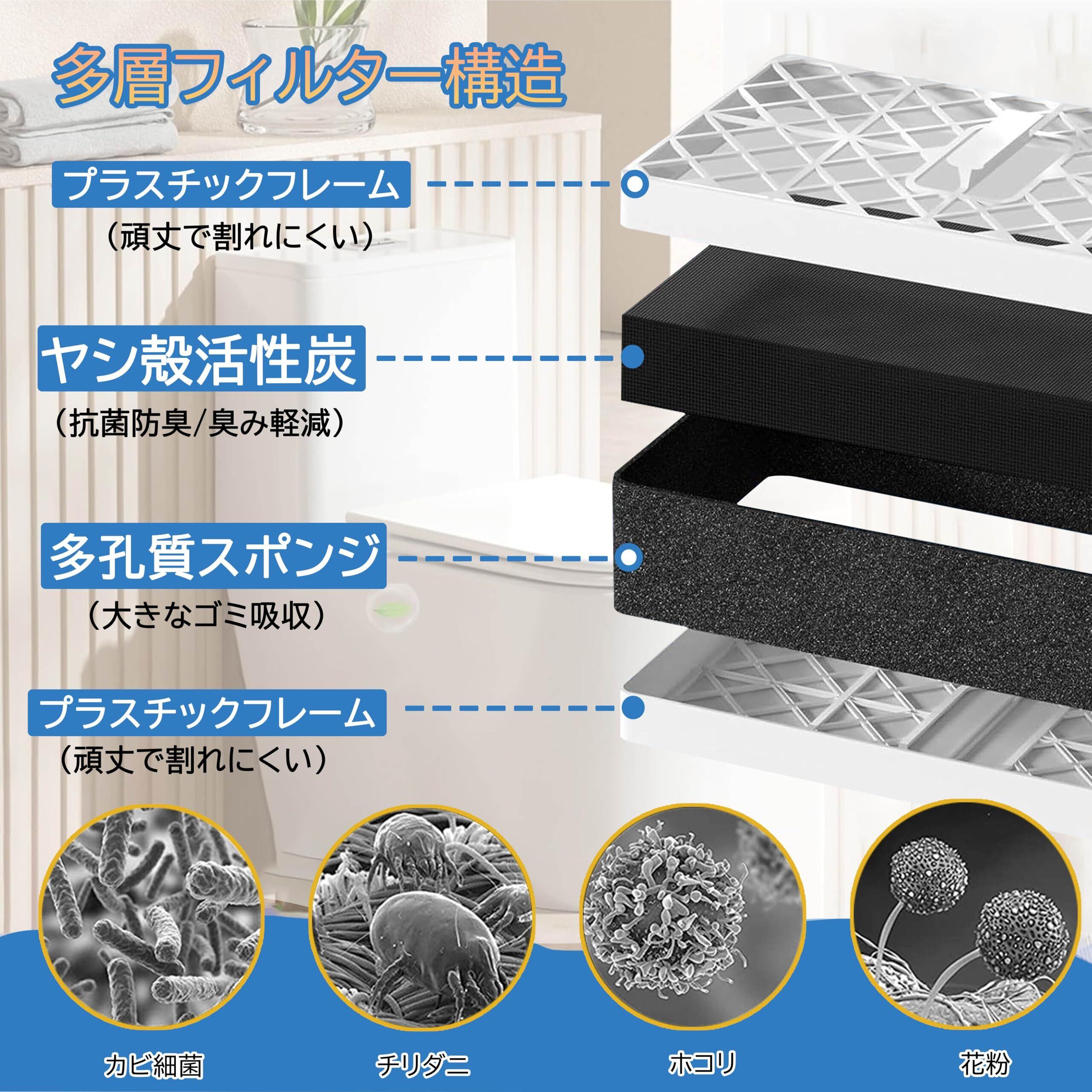 【抜群な濾過率】活性炭フィルターを使用するため、別体のプレフィルタースポンジ、不織布、活性炭とイオン交換樹脂からなり、三重ろ過システムの構造になっている。雑菌、臭みや花粉の除去や空気の浄化に効果的である。いつでも新鮮でキレイな呼吸を提供し、大切な健康維持にピッタリします。