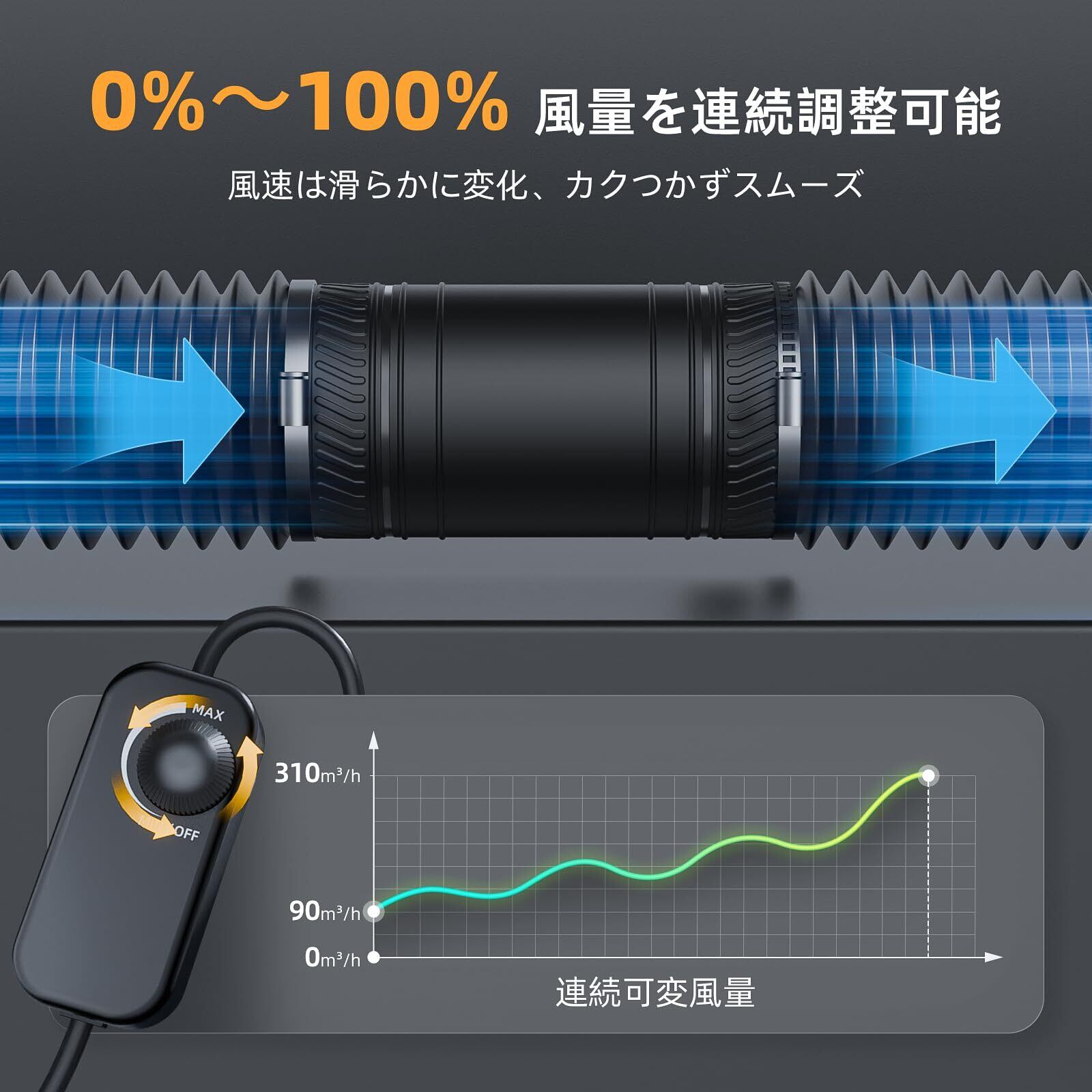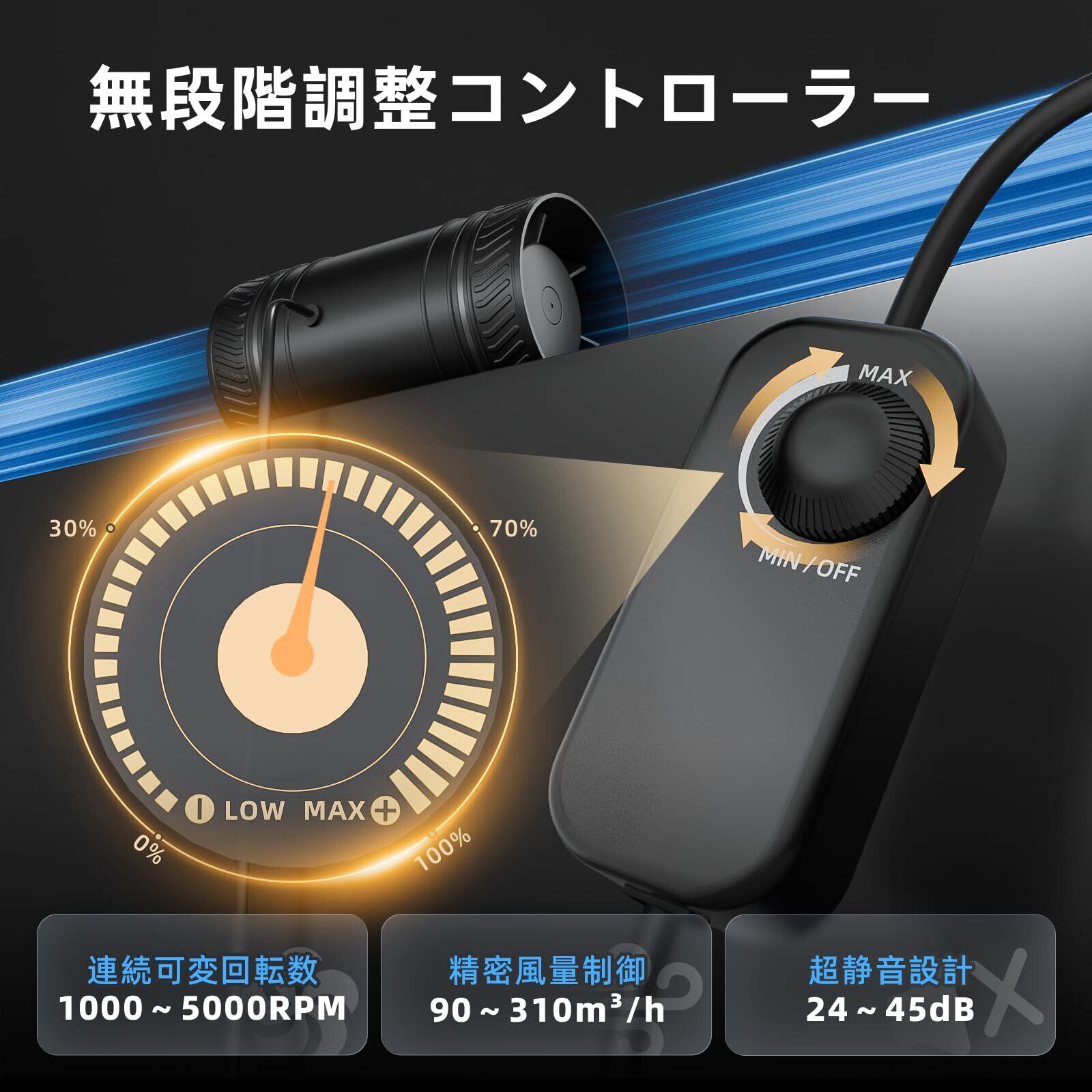 【無段階調速5000RPM】固定の段階設定にさようなら。風量と風圧を自由に調整可能。最大5000RPM、最大310㎥/hの風量を実現。騒音は24〜45dBで、シーンに合わせて快適に使用できます。直管やフレキシブルダクトとの組み合わせがおすすめ。(※ダクトは付属していません)