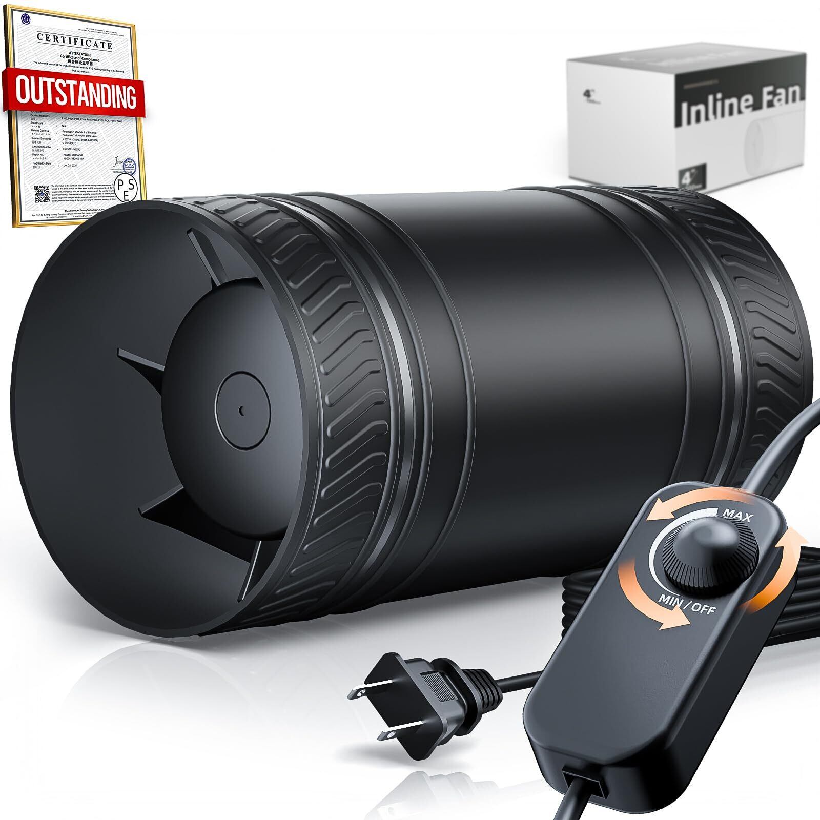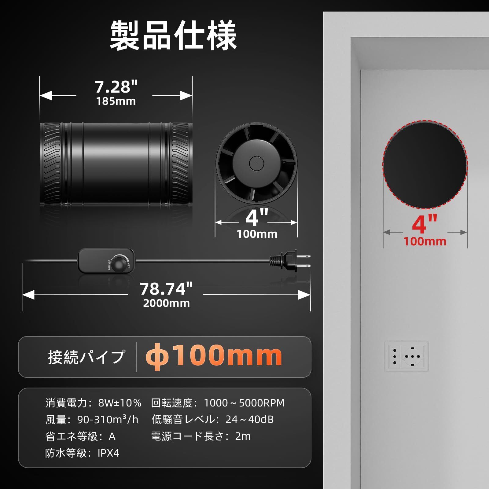 ダクトファン【日本PSE認証取得】中間取付型 静音 強力5000RPM 310m³/h 小型パイプファン 給排気 DCモーター 8W省エネ純銅過熱保護無段階調速【プラグ付き】【2m電源コード】DIY簡単取付けダクト用 塗装ブース用 レーザー彫刻機用 3Dプリンター用 温室 栽培テント 産業用換気扇 100mm/P124