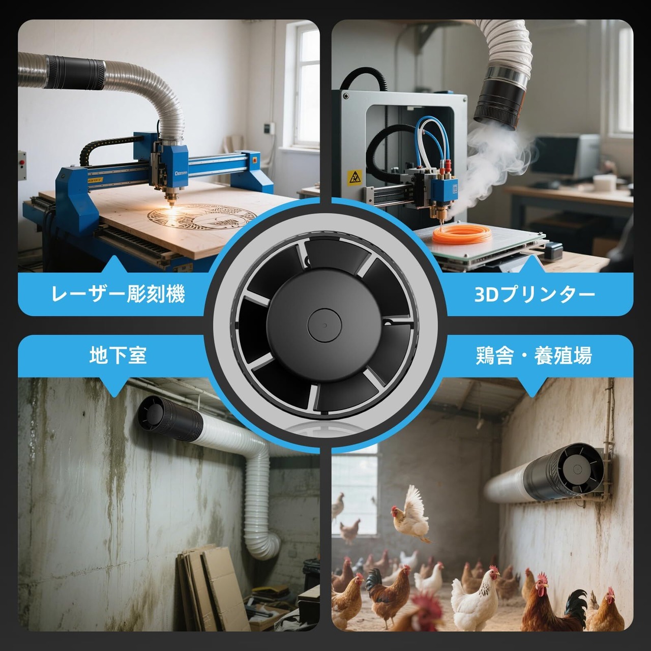 【多様な取り付け方法】1.ダクトファン 100mm 中間取付型:長距離ダクトでも送風・排気効率を強化。2.吸気口取付型:熱気・煙・ニオイを源からすばやく排出。塗装ブース、レーザー加工機、3Dプリンター、家庭の焼肉や鍋料理にも最適。3.排気口取付型:空気の排出を強化し、風の抵抗を軽減。