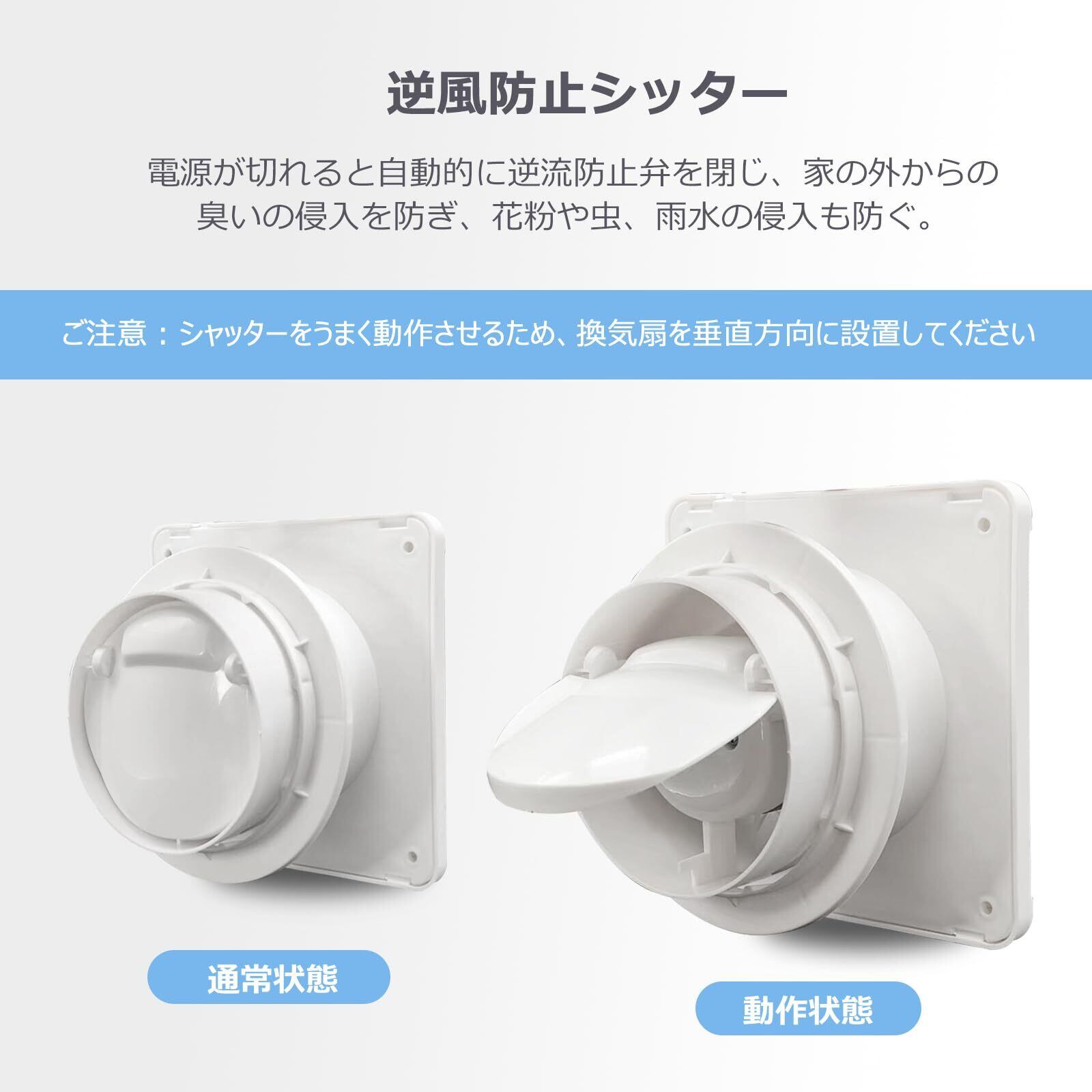 【逆風防止シャッター】逆風防止シャッターが付き、外気の侵入を効果的に防ぎ可能です。ABS素材で、金属の逆風防止シャッターに比べて、自動開閉の騒音を大幅に削減します。その以外、換気扇シャッターが取る外し可能で、さまざまな設置ニーズに対応します。