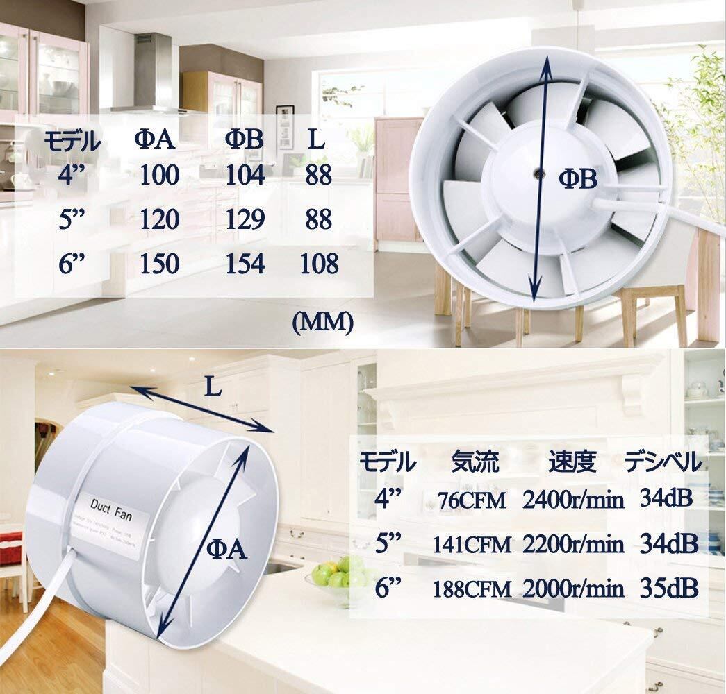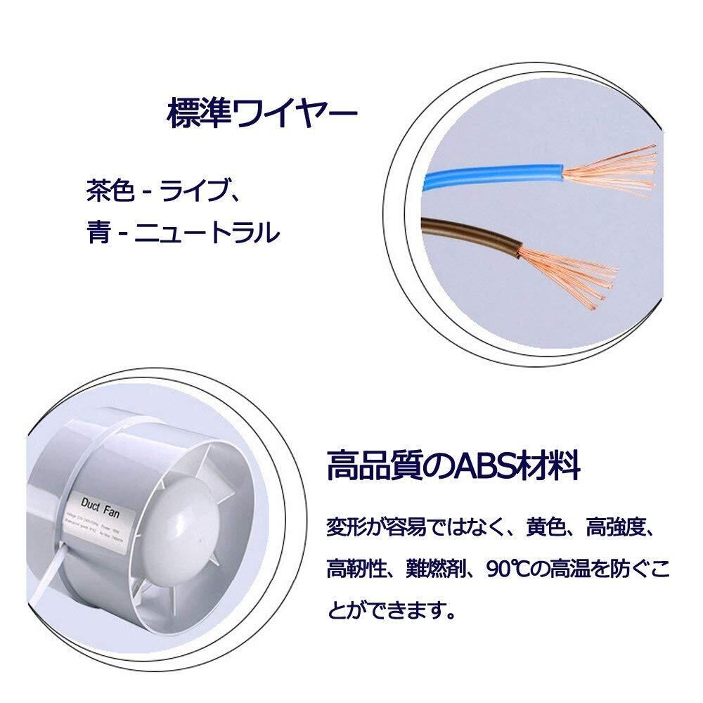 「小型換気扇」適用パイプ径がφ100mmのダクトファンなのに、110V用、わずか12ワットで、特定環境で風量は130m³/Hです。風量は環境により、強さも違いがありますので、予めご了承ください。本体のサイズは前部、後部約97㎜と101㎜です。人工測量なので、何㎜の違いがあり、もし何か質問がありたら、ご遠慮なくご連絡ください。本ダクト ファンは環境にやさしいABS材料を採用して、軽くて変形しにくくて、耐熱性と耐久性に優れています。