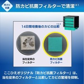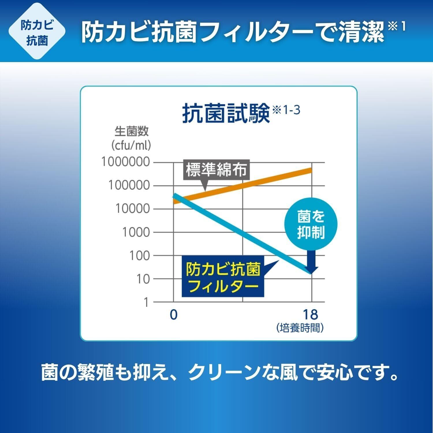 ここひえオリジナル「防カビ抗菌フィルター」は、当社従来のフィルターと比較してカビの繁殖を抑制。菌の繁殖も抑え、クリーンな風で安心です。※全ての菌やカビを抑制するわけではありません。