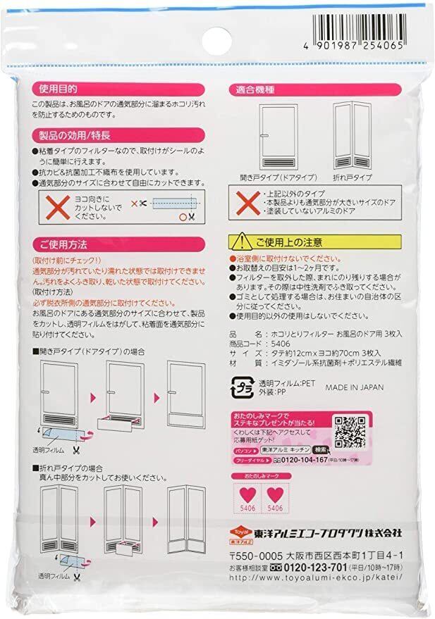 【3個】 東洋アルミ ホコリとりフィルター お風呂のドア用 3枚入 タテ約12×ヨコ約70cm felvita 使用開始日確認シール付 換気扇 お風呂 台所 ホコリ 掃除 梅雨 カビ