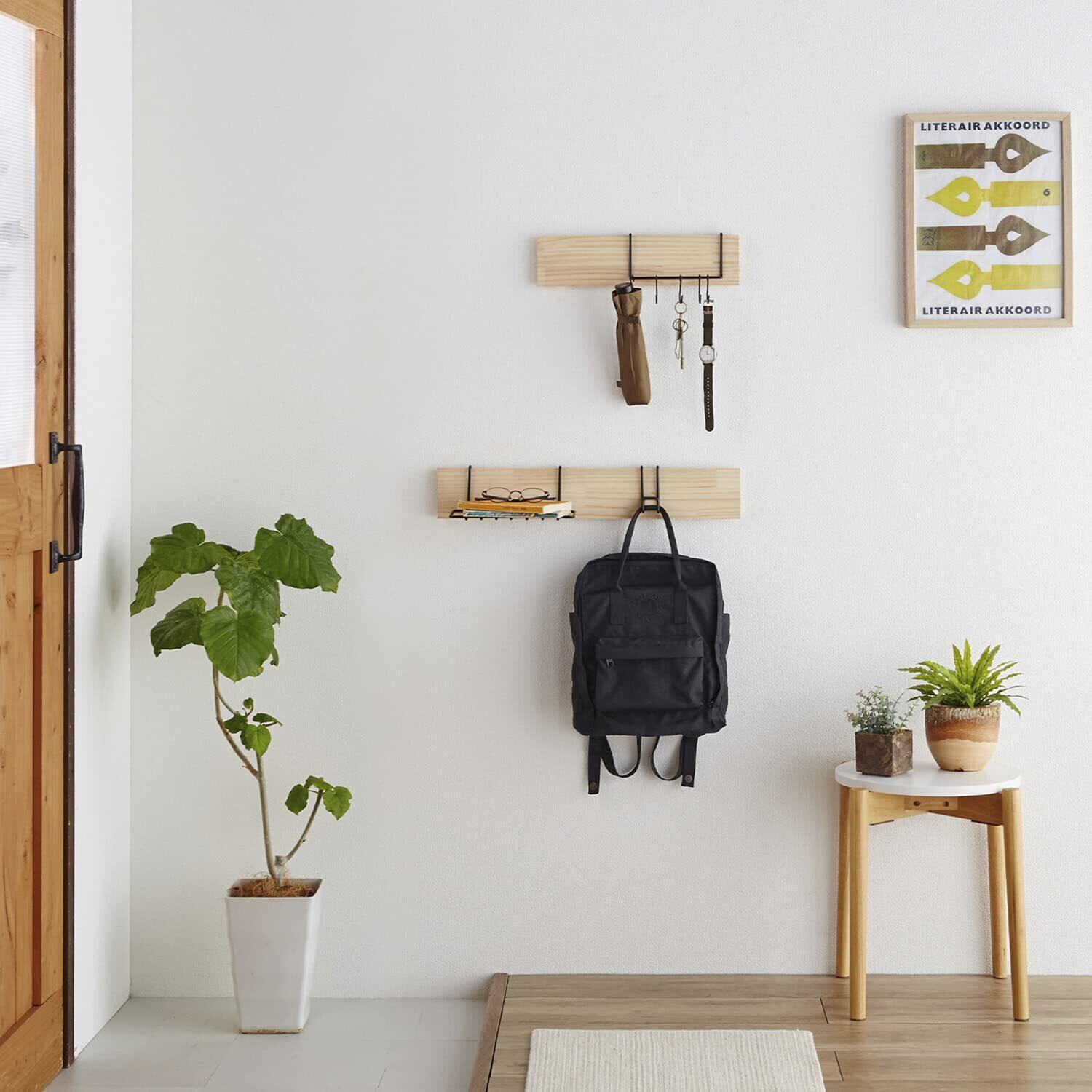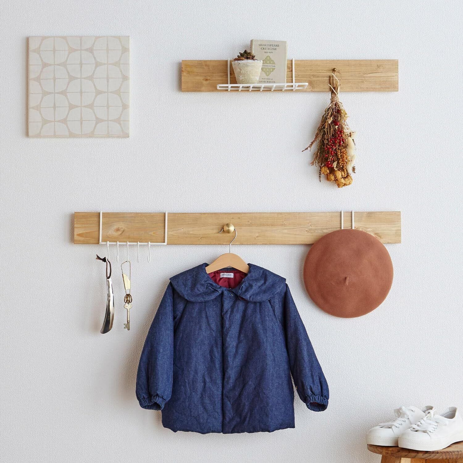 厚み15~19ミリの木材、別売りの専用フック、シェルフ、ハンガーと組み合わせてお好みの壁面収納が作れます。