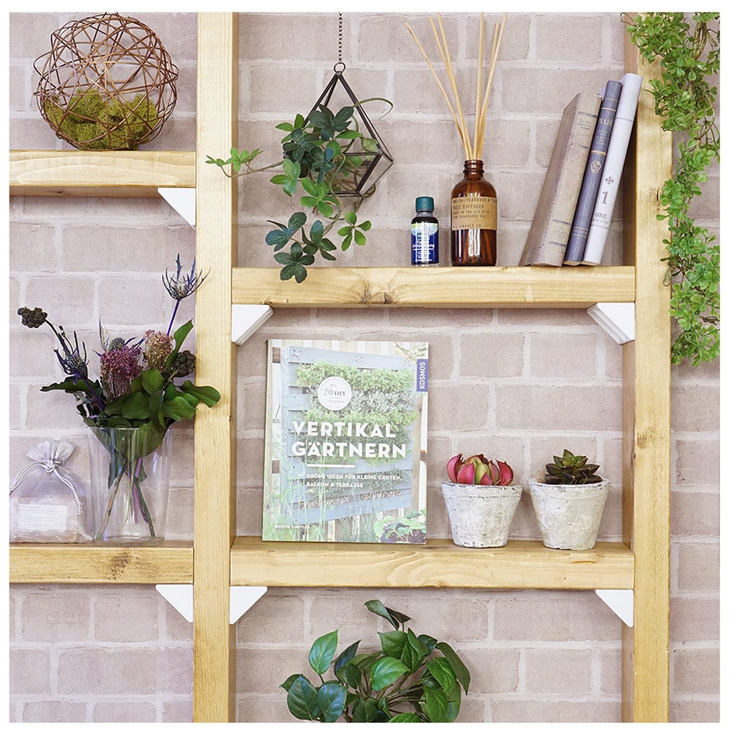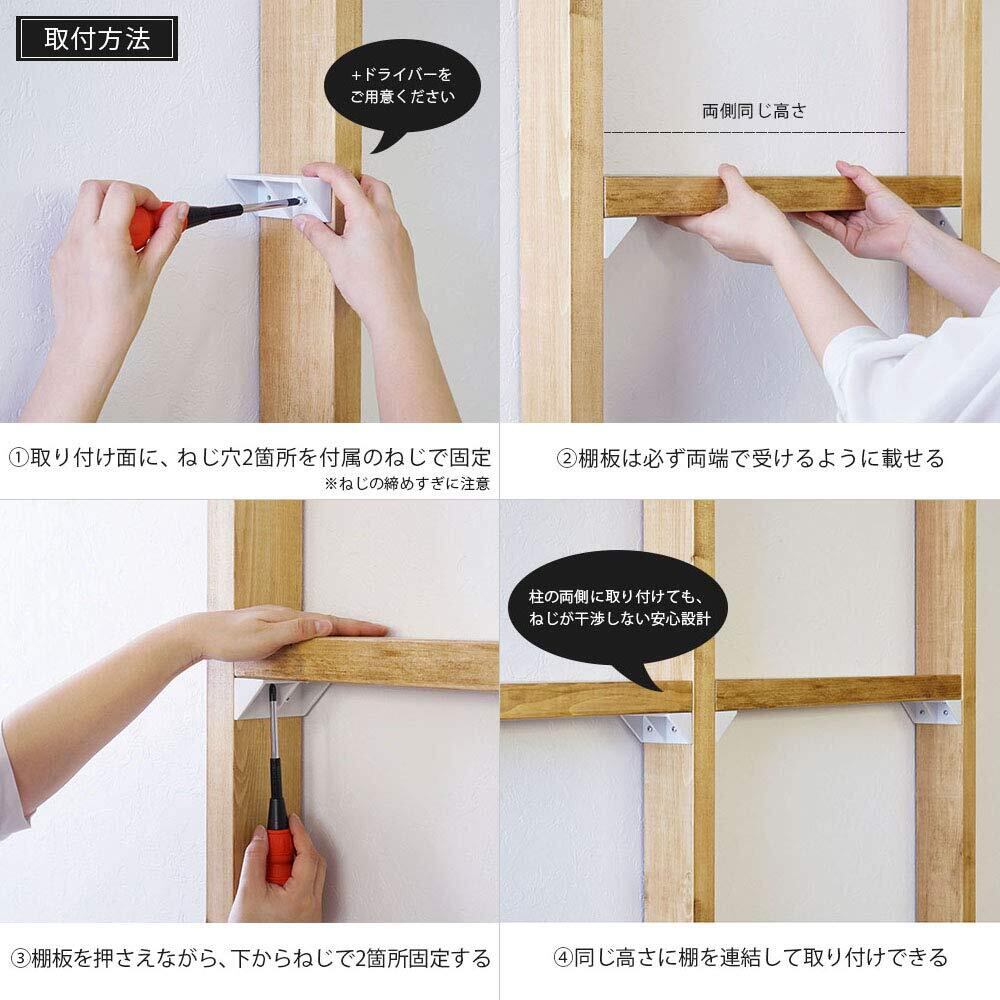 木材で立てた柱に棚を取り付けるための棚受けパーツ。柱をしっかり設置した後に後付けするタイプの棚受けなので、取付けしやくすく、じっくり棚の高さを決められます。