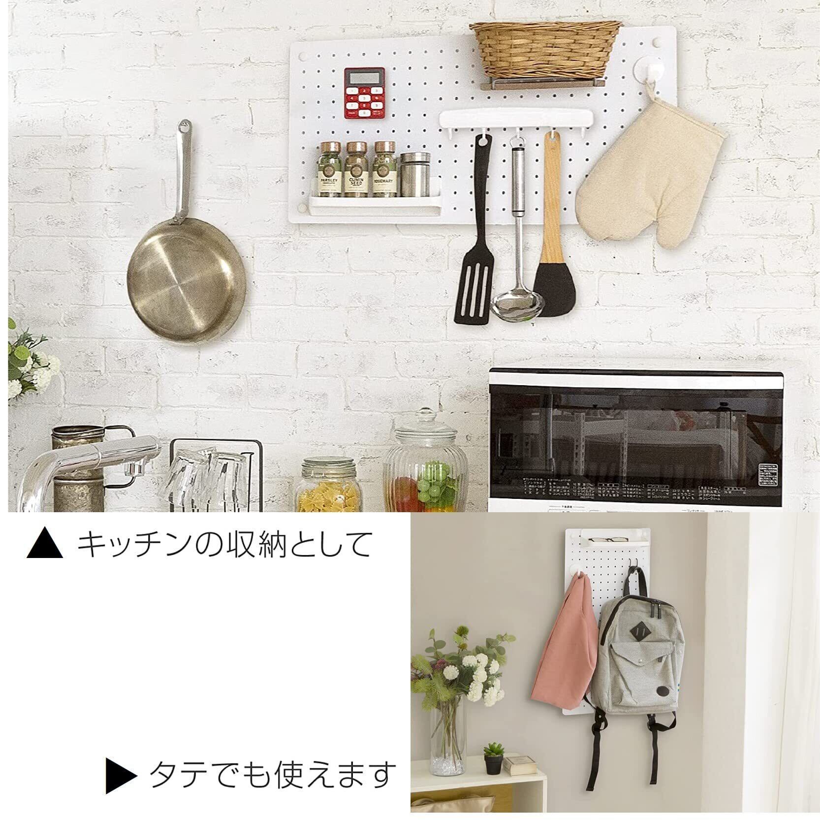 マグネットにも対応している有孔ボード。孔間隔25mm・穴径5㎜の有孔ボードフックに対応しているのであらゆる場面で活躍できます。【キッチン】キッチンツールを掛けたり、マグネットのタイマーを付けたり【玄関・リビング】カバンや鍵などの収納に【DIY】工具の引っ掛け収納に【KIDS】学校からのプリントや写真を貼ったり【デスクサイド】文房具などの収納に【ゲーミング収納】キーボードやヘッドホン、マウスなどの収納に