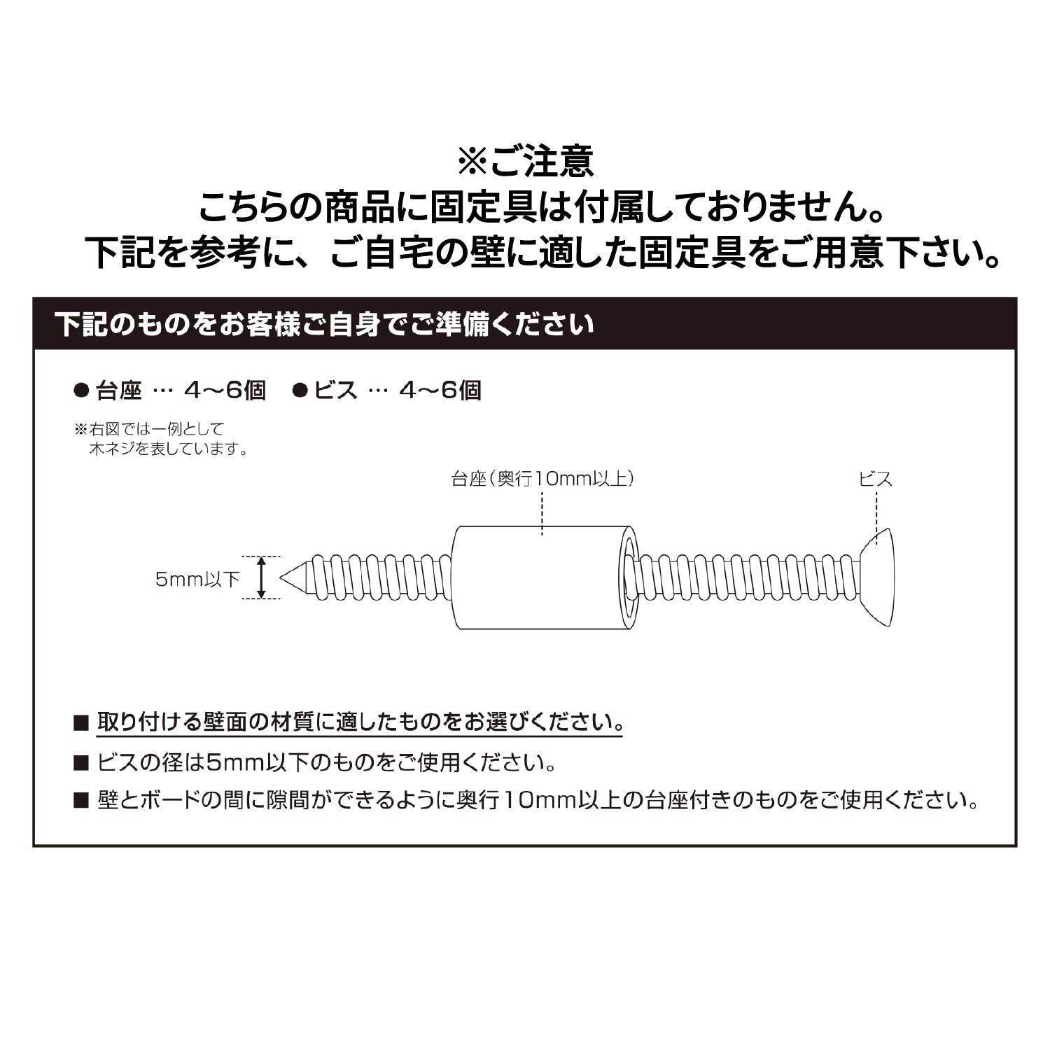 ※本商品に固定具は付属しておりませんので、設置する壁に合わせて金具をご用意下さい(必要金具:5㎜以下のビス4-6個、台座(奥行10㎜以上)4-6個)