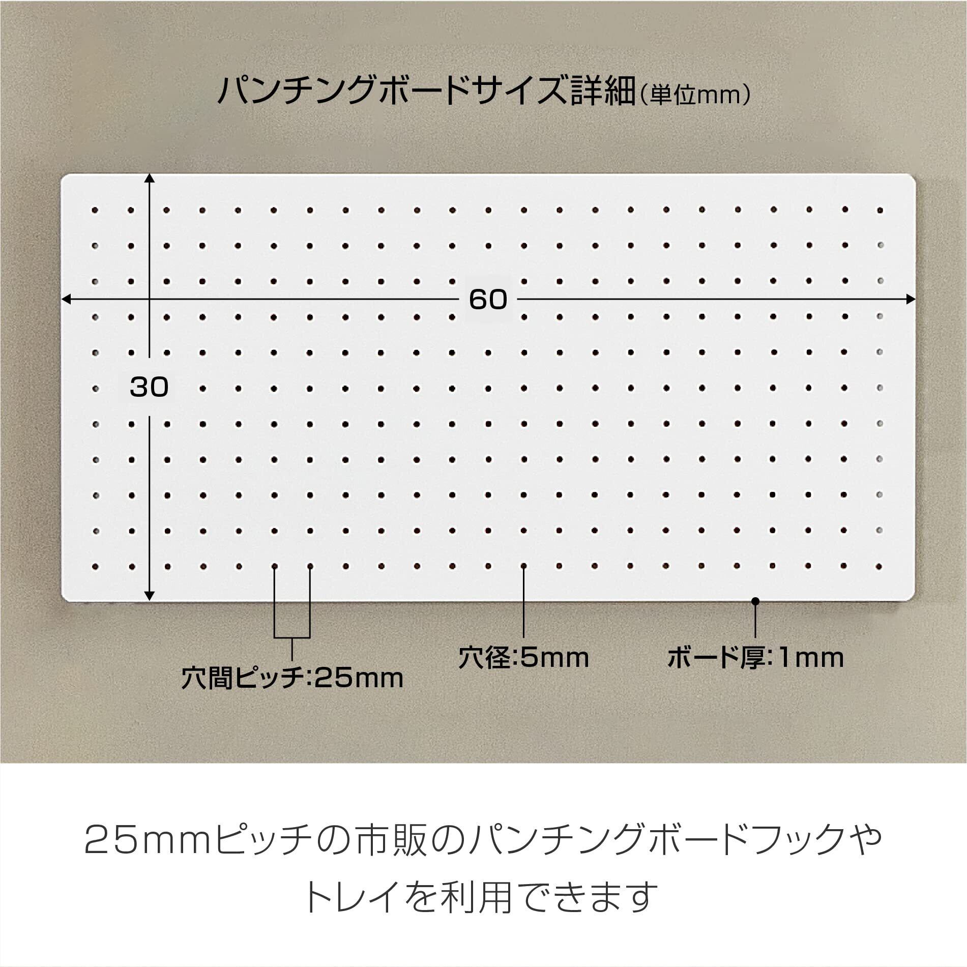 ●本体サイズ:幅600×高さ300×奥行(厚み)1mm●材質:金属(スチール)、エポキシ樹脂粉体塗装●孔間隔25mm●穴径5㎜●全体耐荷重10kg●お客様組立品