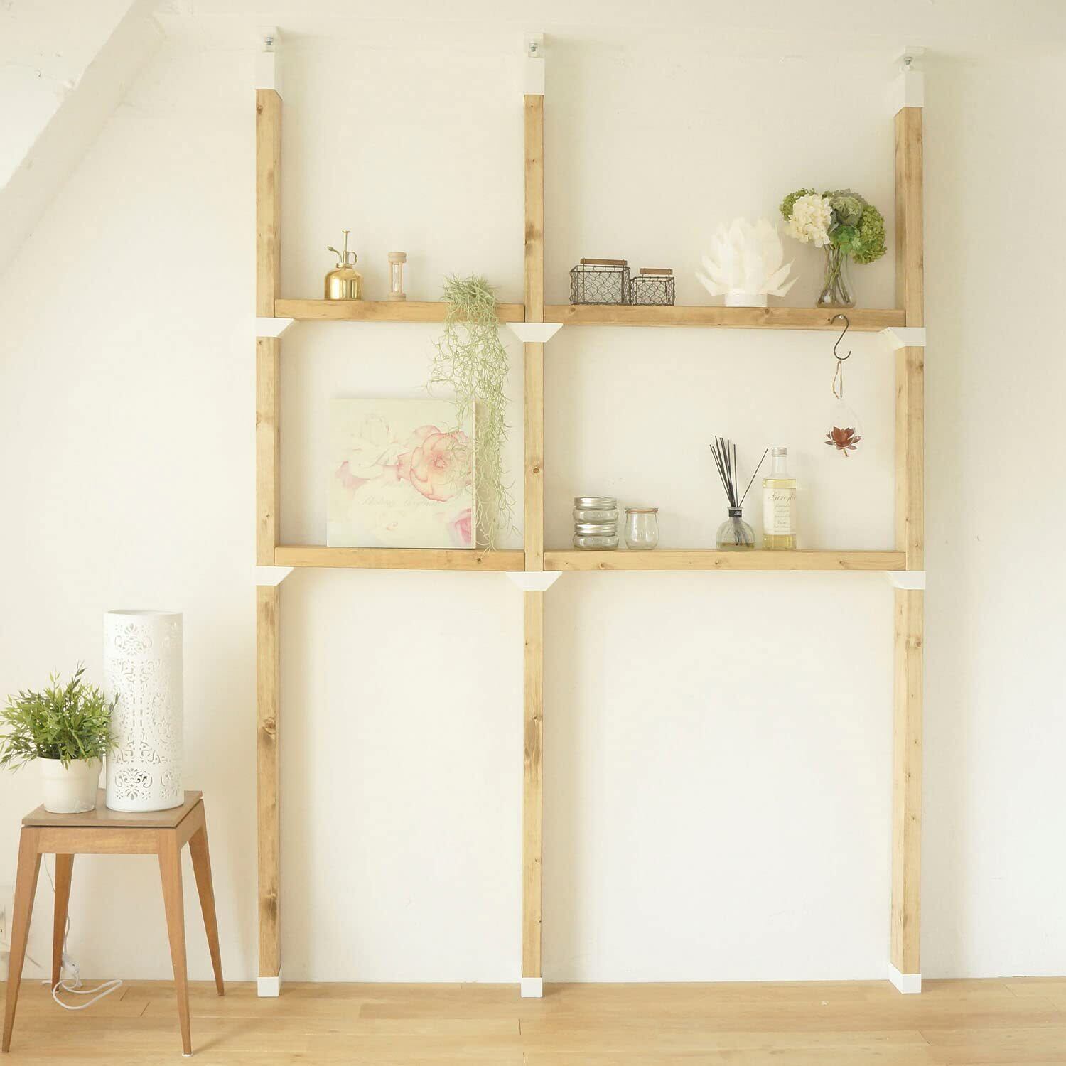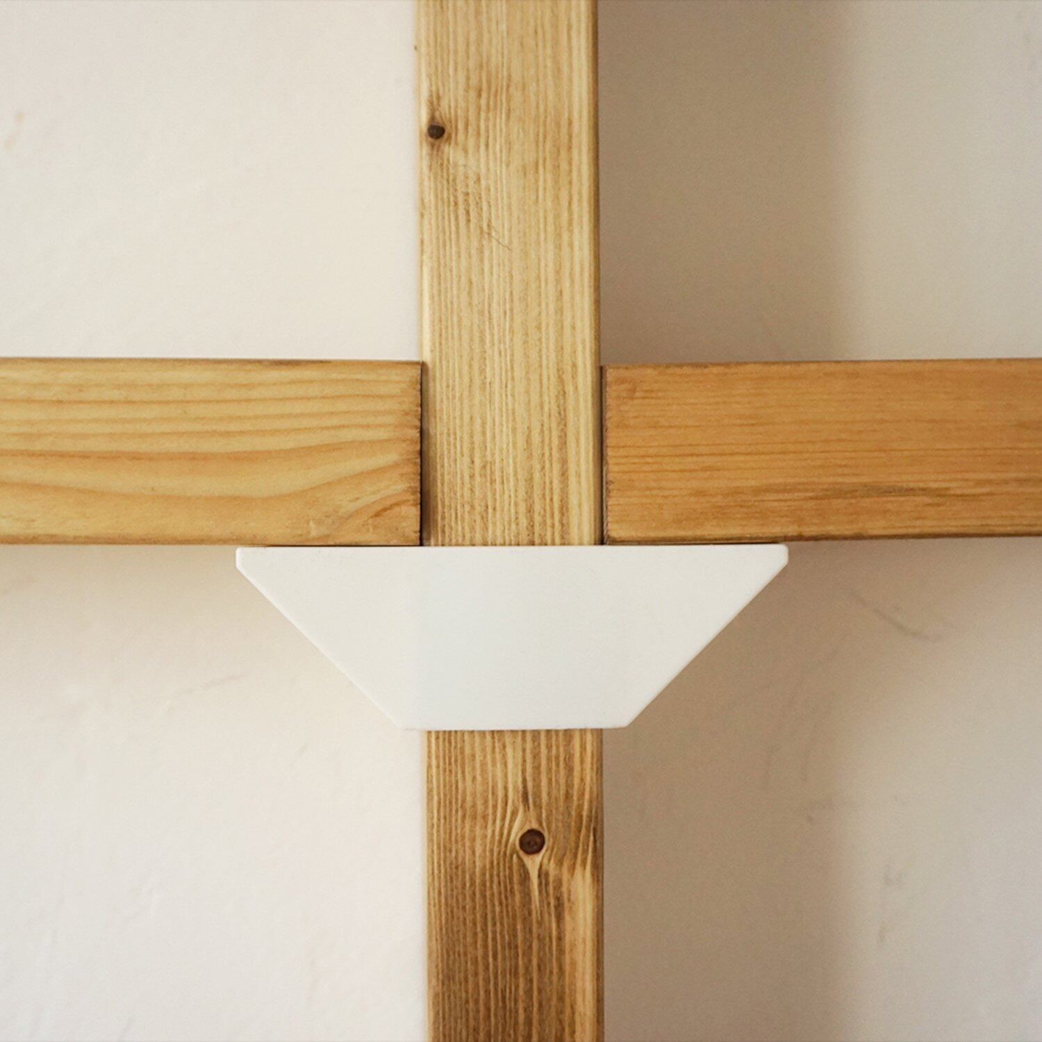 2×4木材の柱に棚を取り付けるための棚受けパーツ。柱の両側に棚を付けたい時、このパーツ1つで取付けできます。