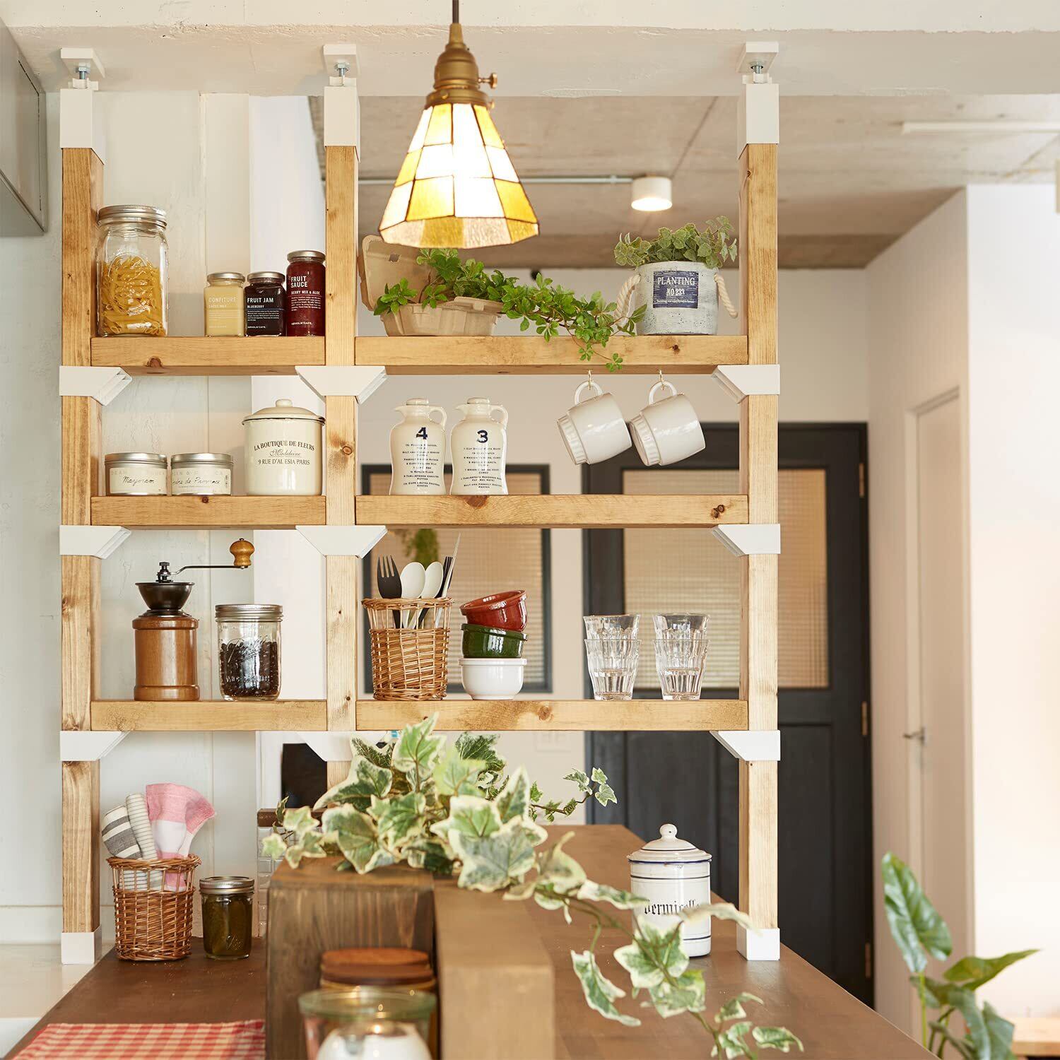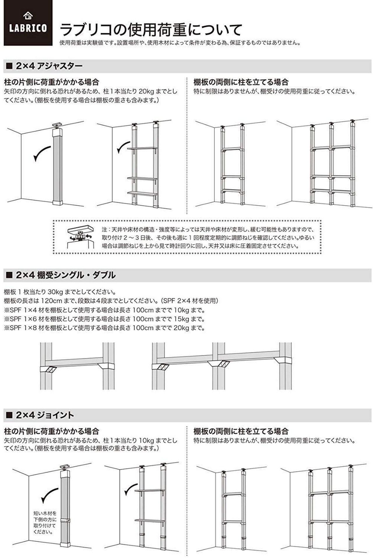 ・棚板に2×4材を使用する場合、棚板1枚当たりの使用荷重は30kg、棚板の長さは120cmまでとしてください。