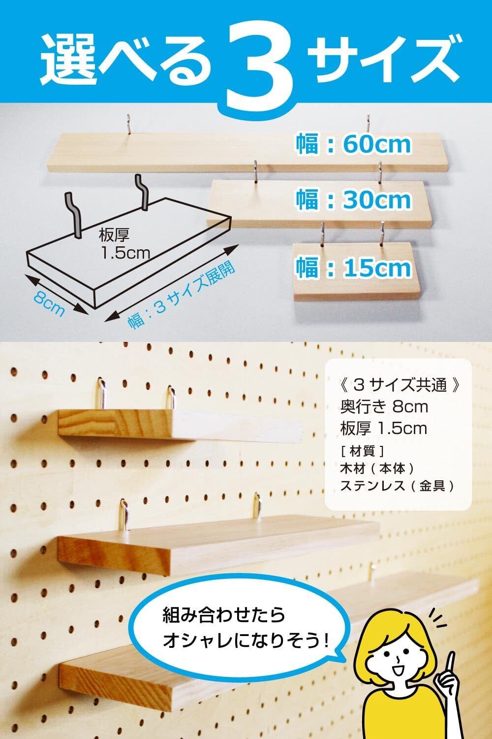 《サイズ》板の奥行き 8cm / 板厚1.5cm (3サイズ共通) / ニス仕上げ(つや消し)