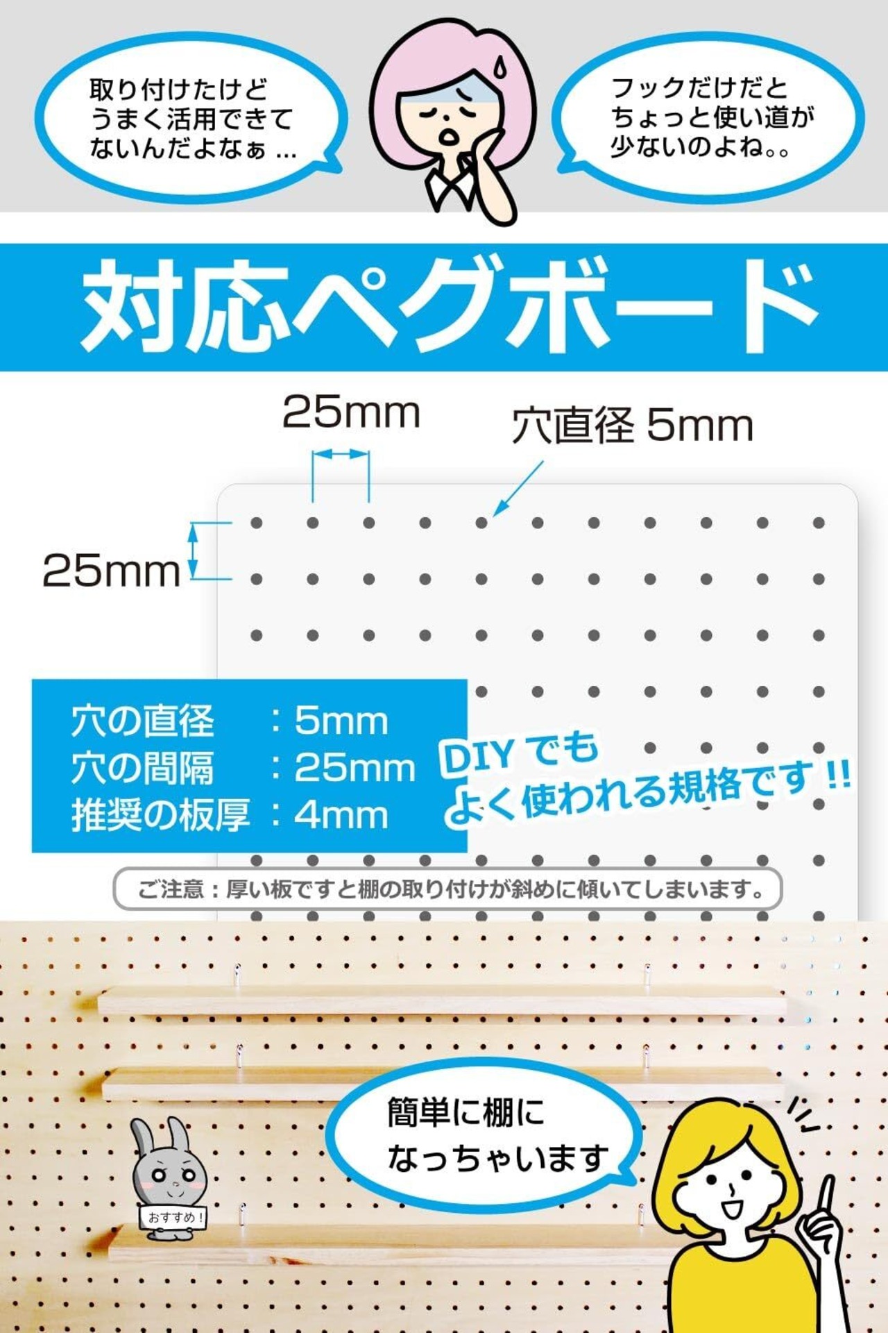 【同規格ならメーカー問わずご使用OK】穴の直径5mm・間隔25mm・板厚4mmのペグボード専用。