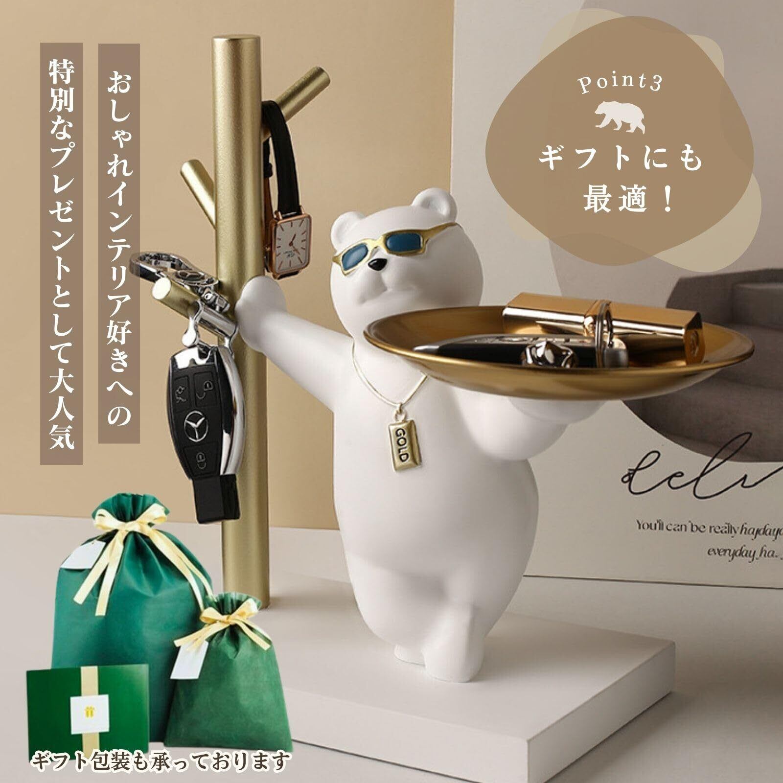げんかんのユニークでおしゃれな収納インテリア: サングラスをかけたスタイリッシュなシロクマが、玄関やリビングに個性的なアクセントを加えます。鍵置きなどに小物置きに使える、収納トレーとアクセサリースタンドが一体化しており、鍵やサングラス、アクセサリーをすっきりと整理できます。玄関 鍵置きとしても活躍します。