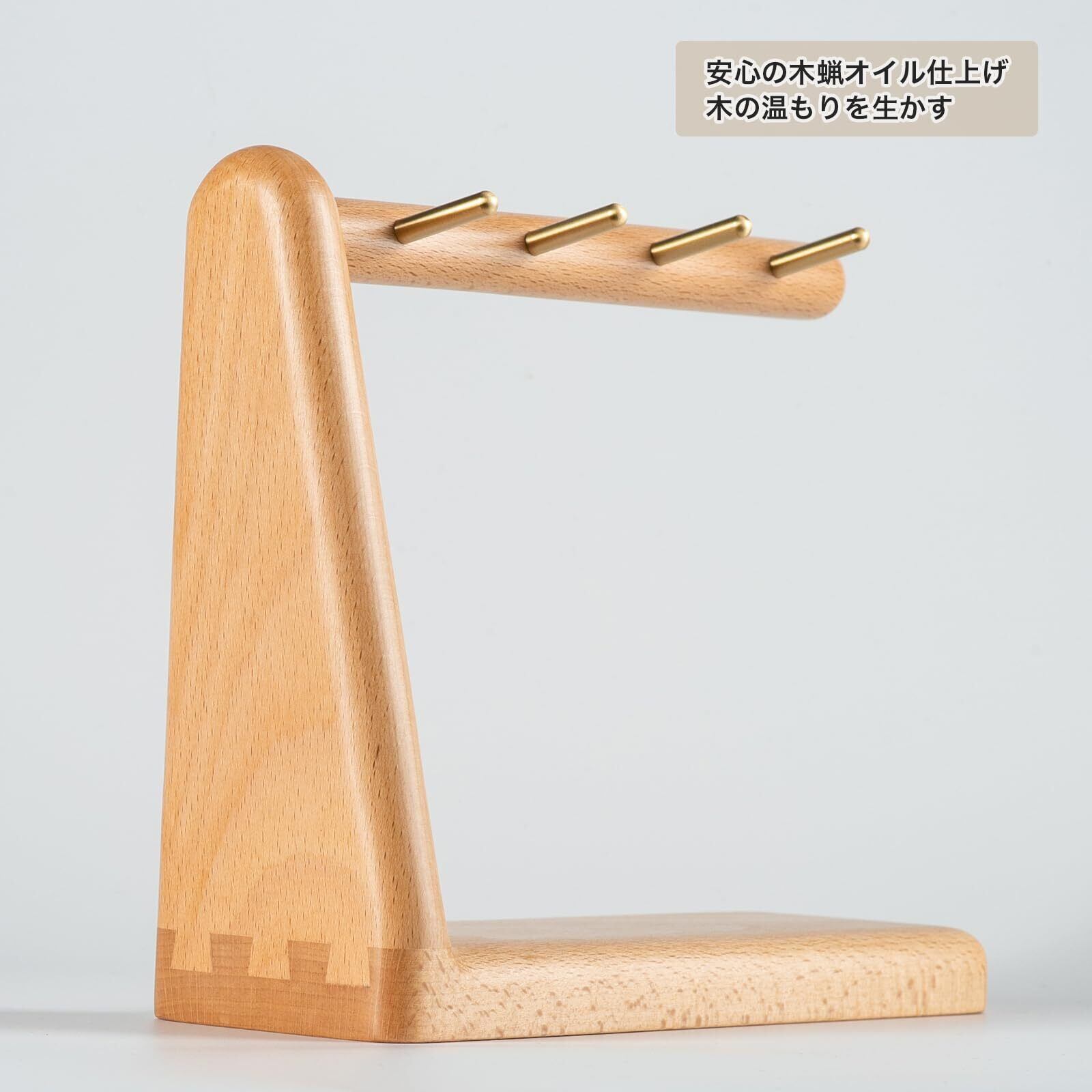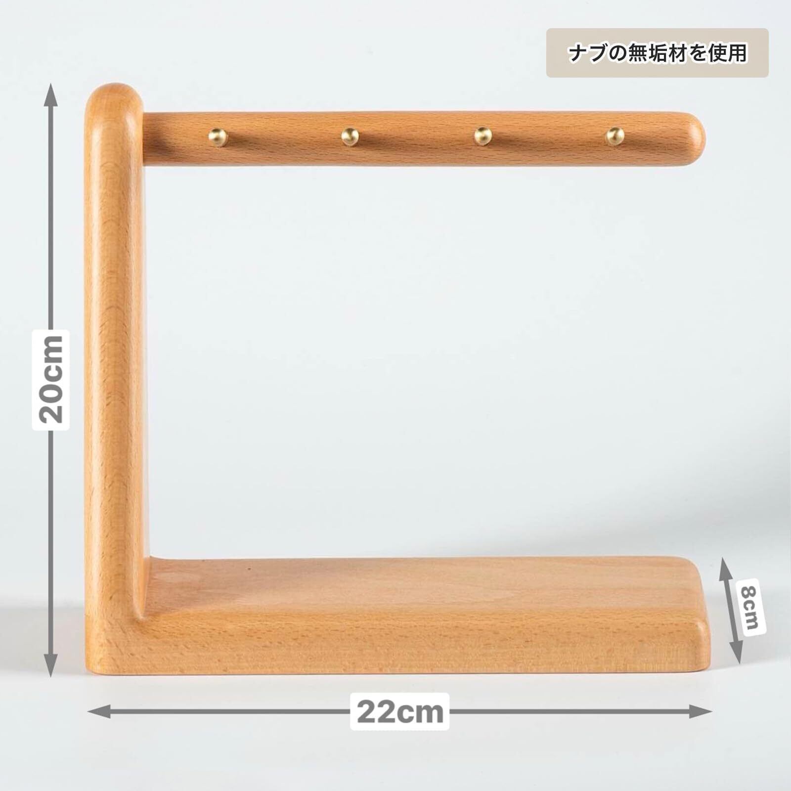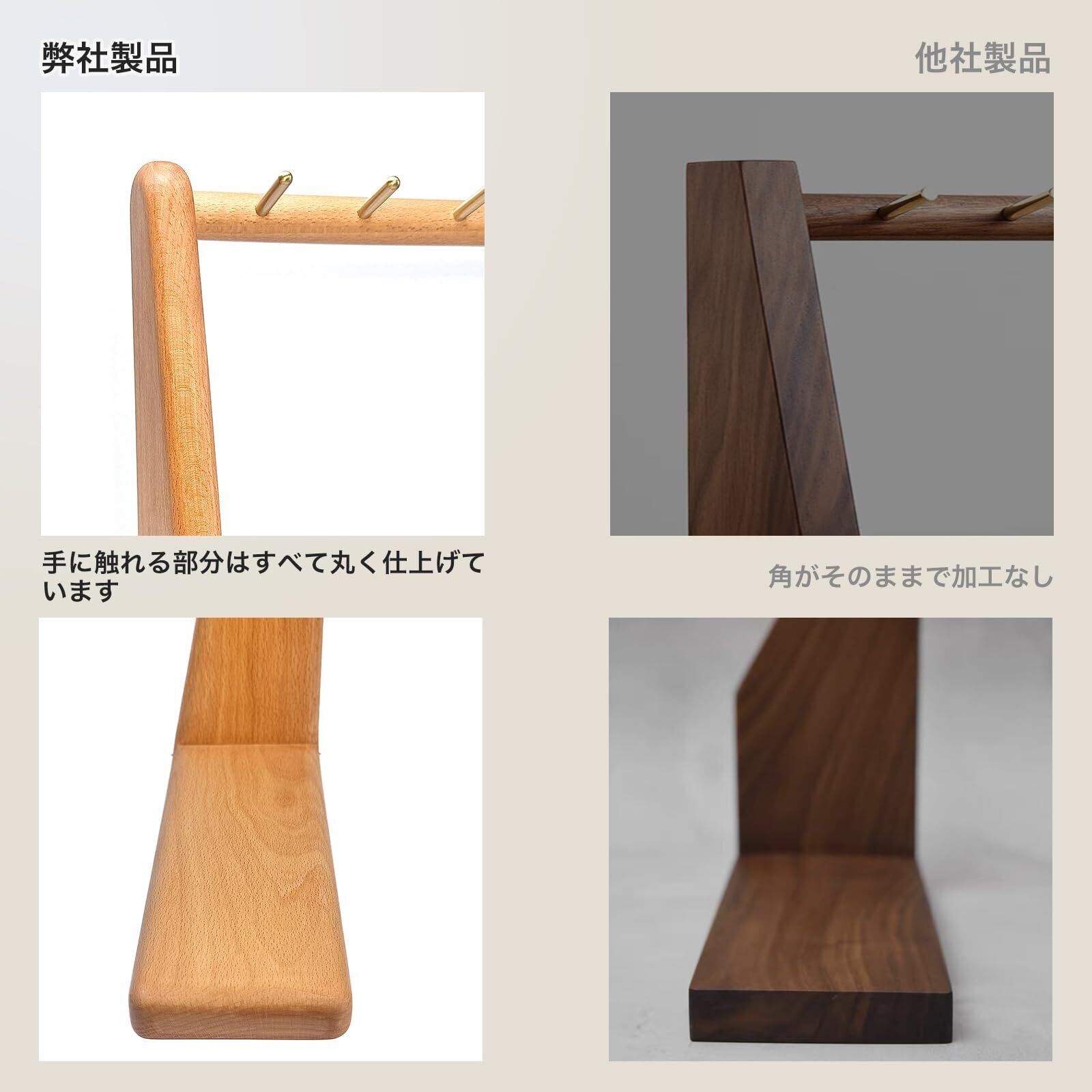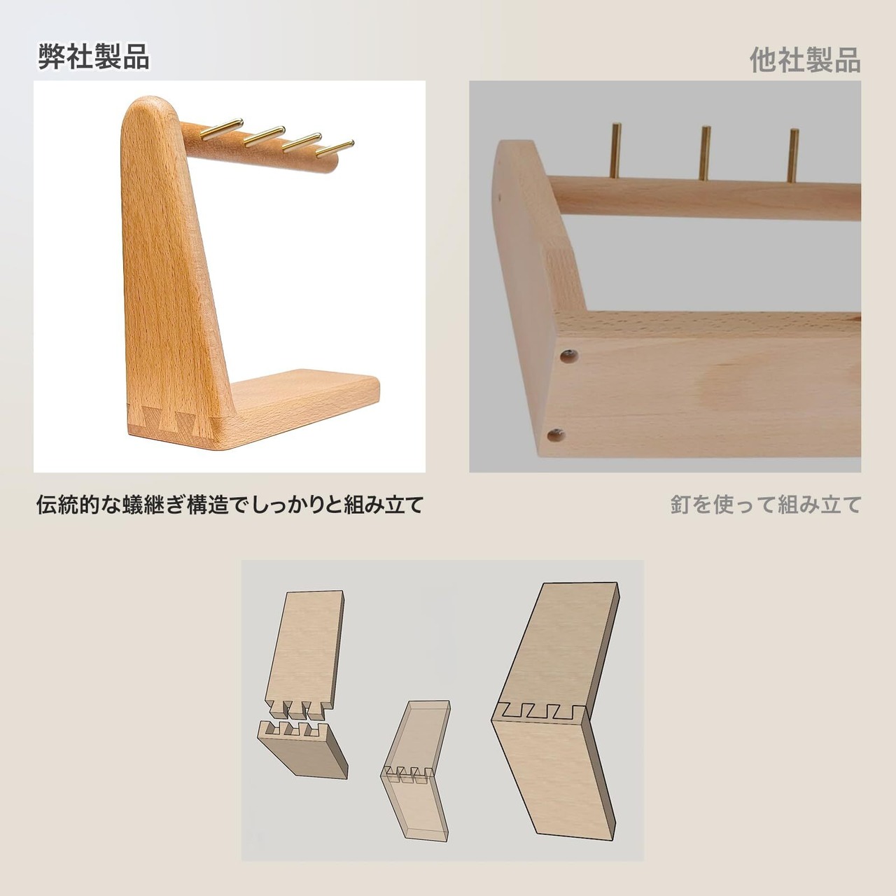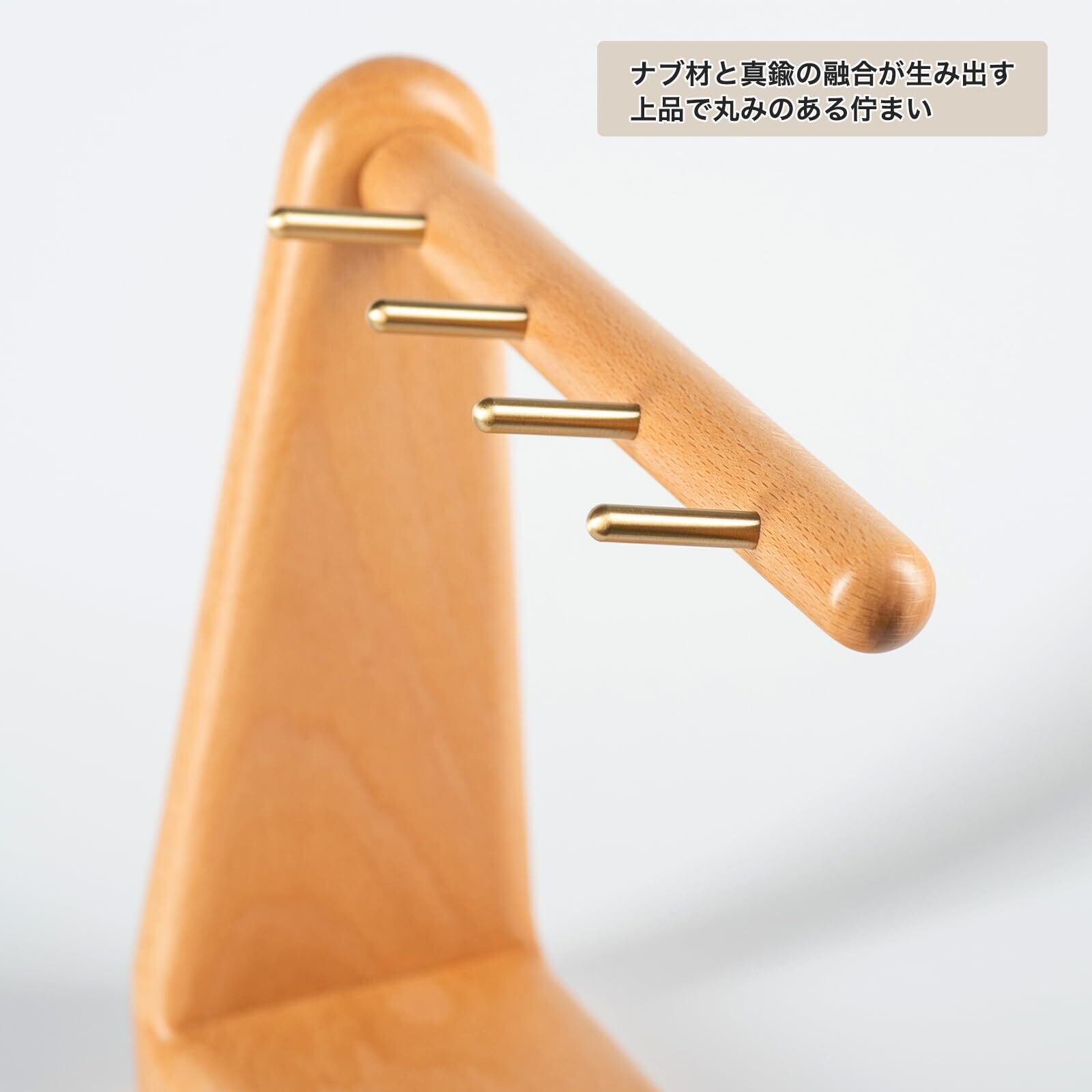 【伝統の技・蟻継ぎ構造】釘を一本も使わず、伝統的な蟻継ぎ(ありつぎ)構造でしっかりと組み上げられており、丈夫で長く使えるつくりです。無垢の真鍮棒は丁寧に埋め込まれており、先端がわずかに上向きになっているため、鍵などが滑り落ちにくい安心設計です。