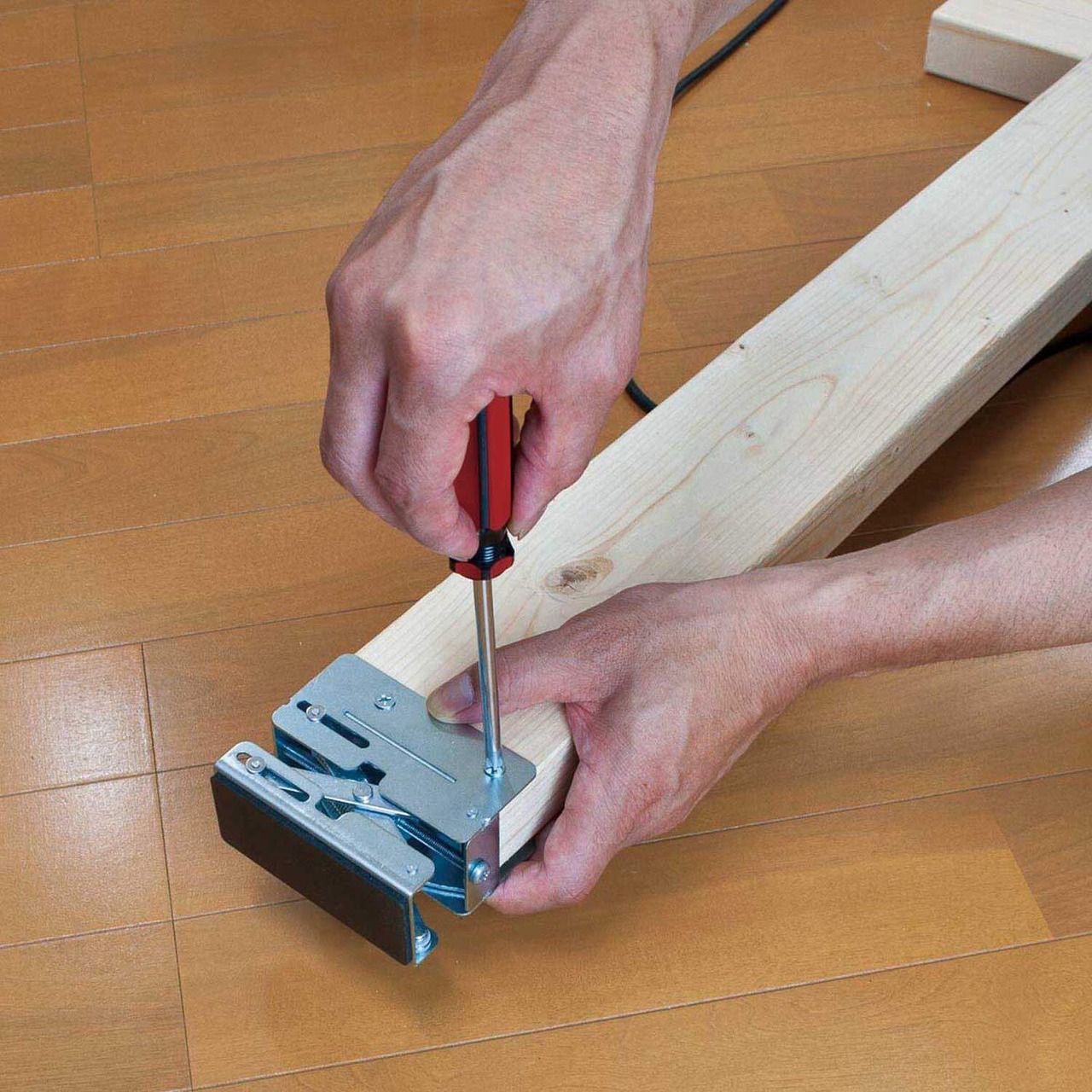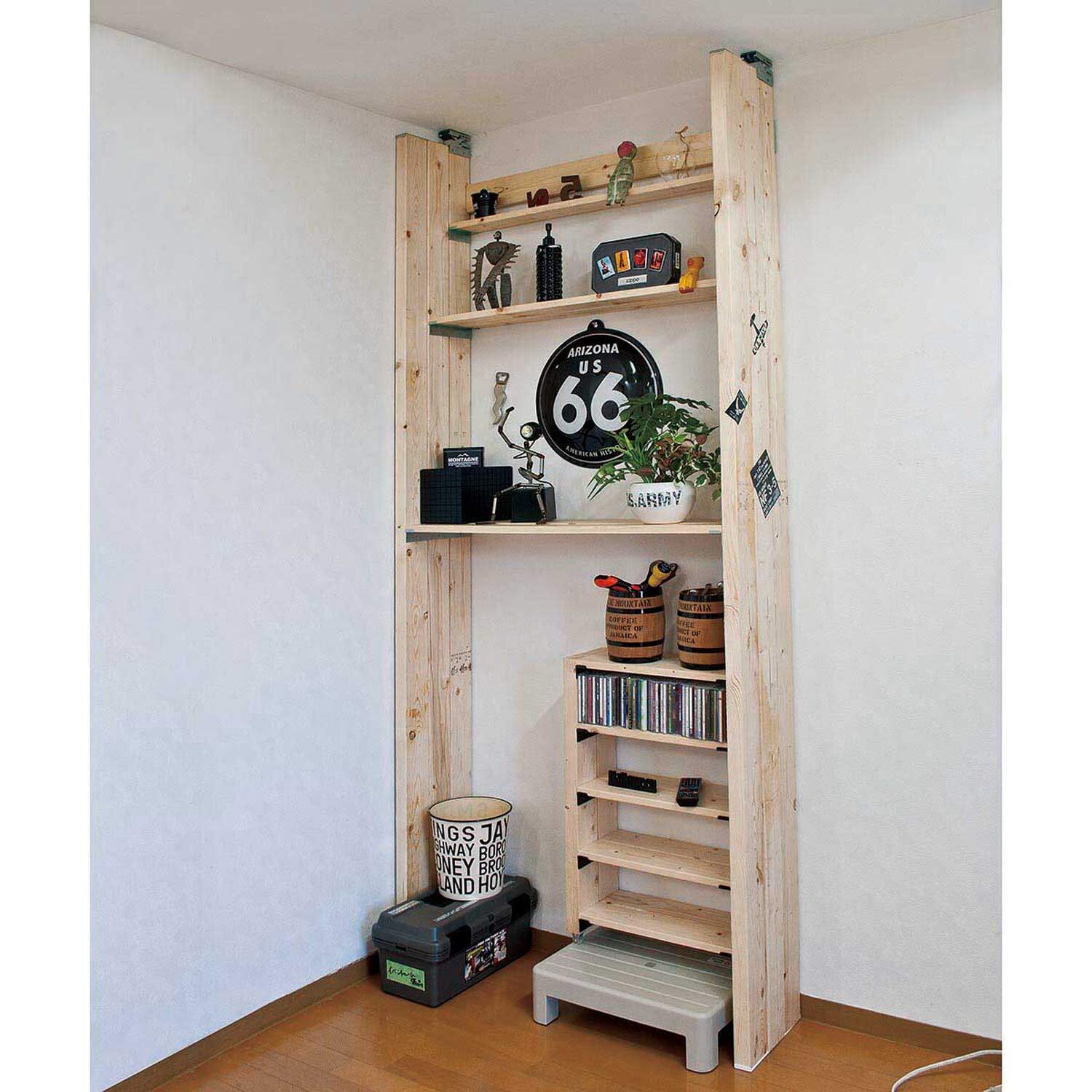ジャッキ+バネの力で、市販のツーバイ材をしっかり固定でき、オリジナルの棚が簡単に作れる