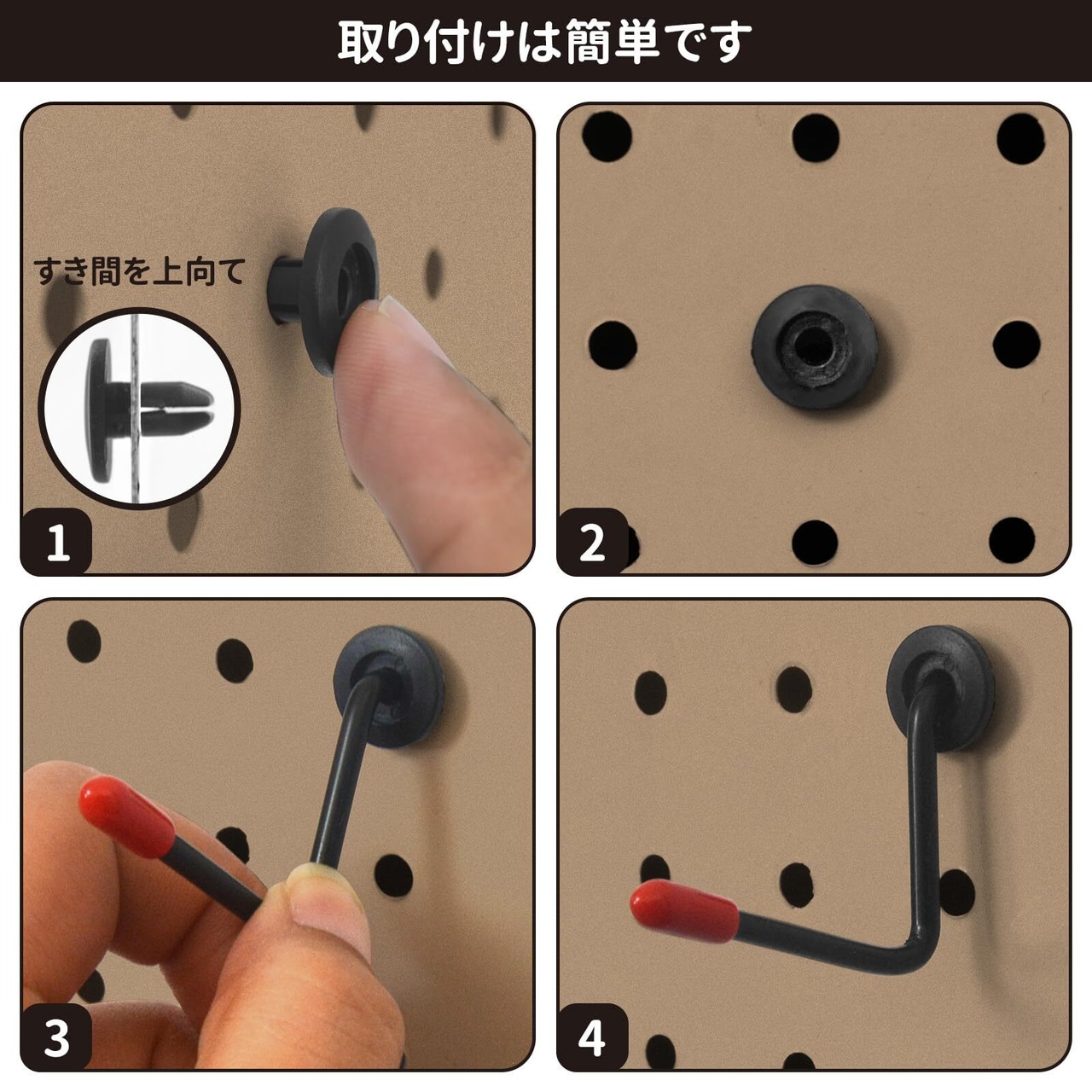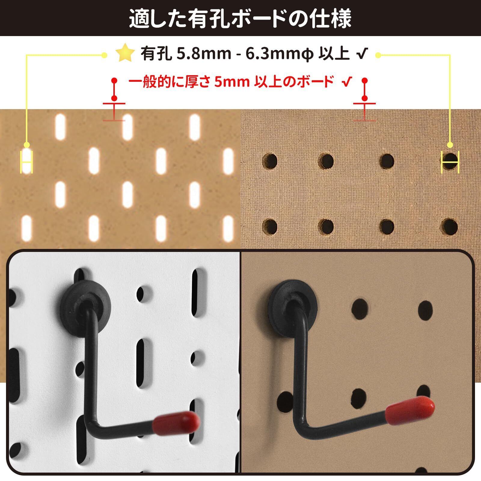 適用:専用L型フックをペグボードに取り付けるのにはとても便利です。使用中も安定し、安全です。 適用ペグボードの厚さ:5mm以上の厚さに対応しています。穴のサイズ:直径5.8-6.3mm以上の穴に適用です。