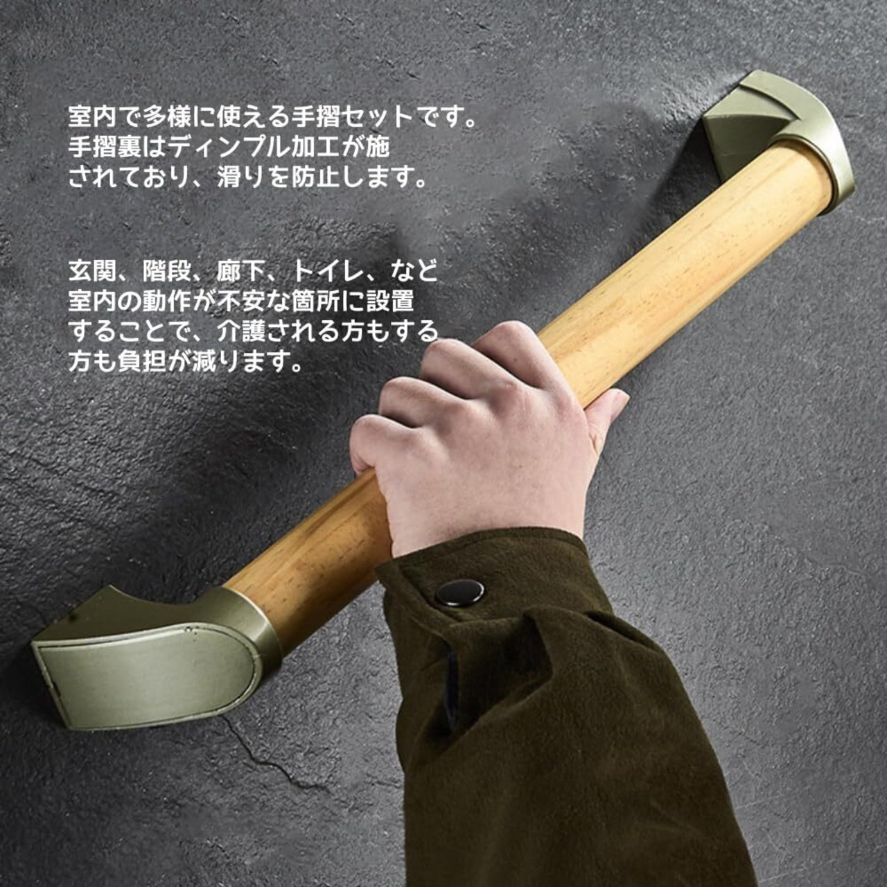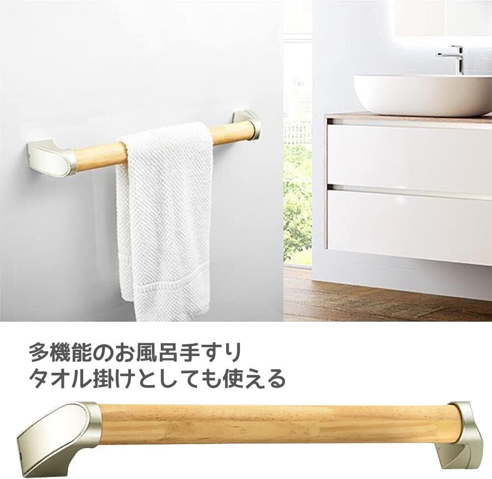 【浴室 手すり 34/44cm優れった素材】自然木を使用したぬくもりある上質な握り心地です。すべりにくいディンプル加工で、観た目はシッカリ、握るとシックリ。 安全援助の理想的な保健指導補助具です。