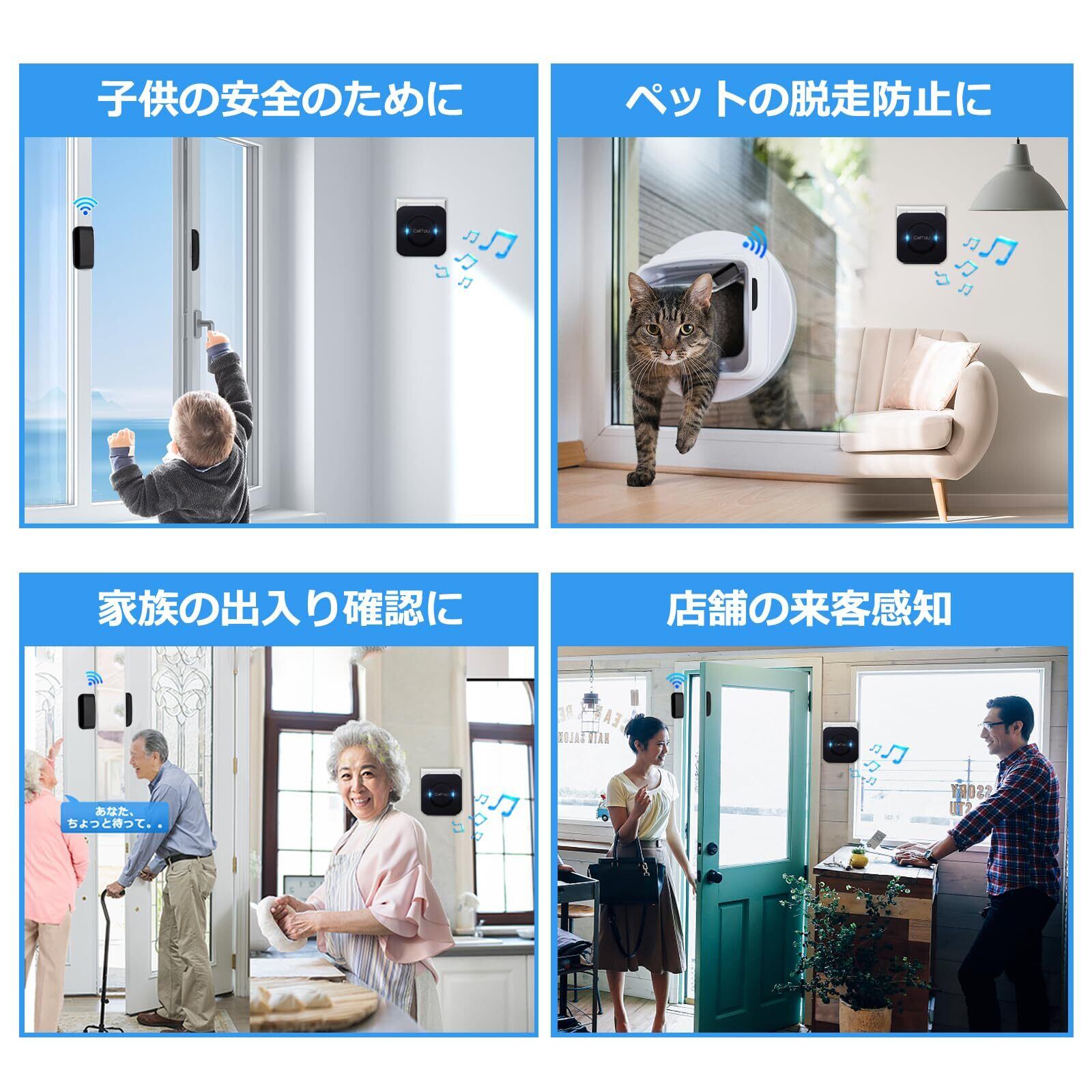 ▶【離れた場所からドアや窓の状況を確認】こちらのCallToUワイヤレスセンサーをドアや窓に貼るだけでドアや窓の開くと、センサーがトリガーされて信号が送信され、受信機が信号を受信してアラートを送信します。家族の出入り検知とか来客検知とか盗難防止なと事ができます。自宅やマンションやガレージやお店舗、事務所等場所で防犯ブザーとして又はドアベルとか徘徊センサーなととして利用できます。