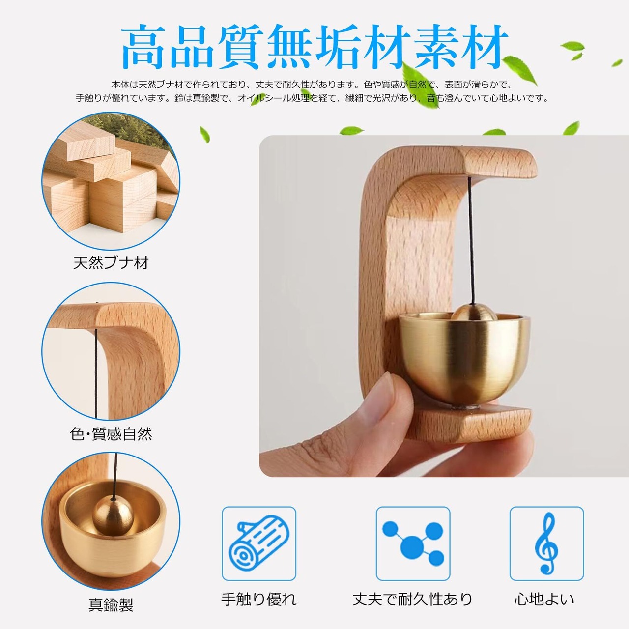 【高品質無垢材素材】ドアベルの本体は天然ブナ材で作られており、厚くて割れや変形しにくく、丈夫で耐久性があります。色や質感が自然で、表面が滑らかで、手触りが優れています。鈴は真鍮製で、オイルシール処理を経て、繊細で光沢があり、音も澄んでいて心地よいです。