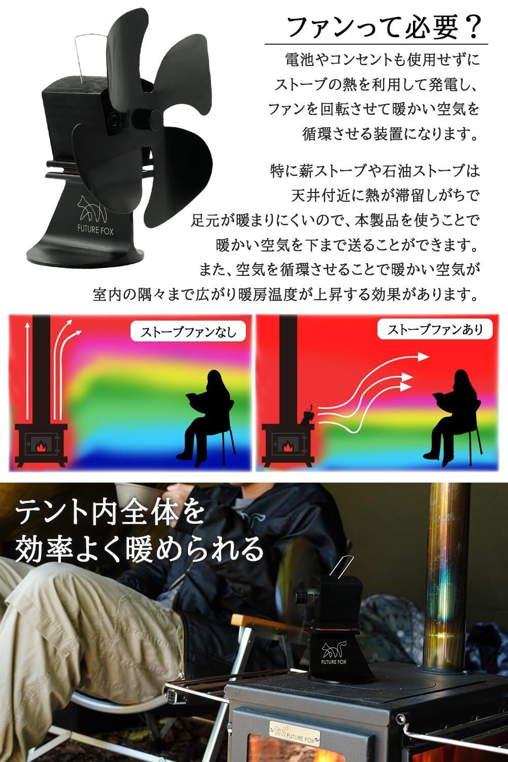 【FANは必要?】熱は天井付近に滞留しがちで足元が暖まりにくいので、FUTUREFOX FOX-FANを使うことで、暖かい空気を下まで送ることができます。また、空気を循環させることで暖かい空気が室内の隅々まで広がり暖房温度が上昇する効果があります。