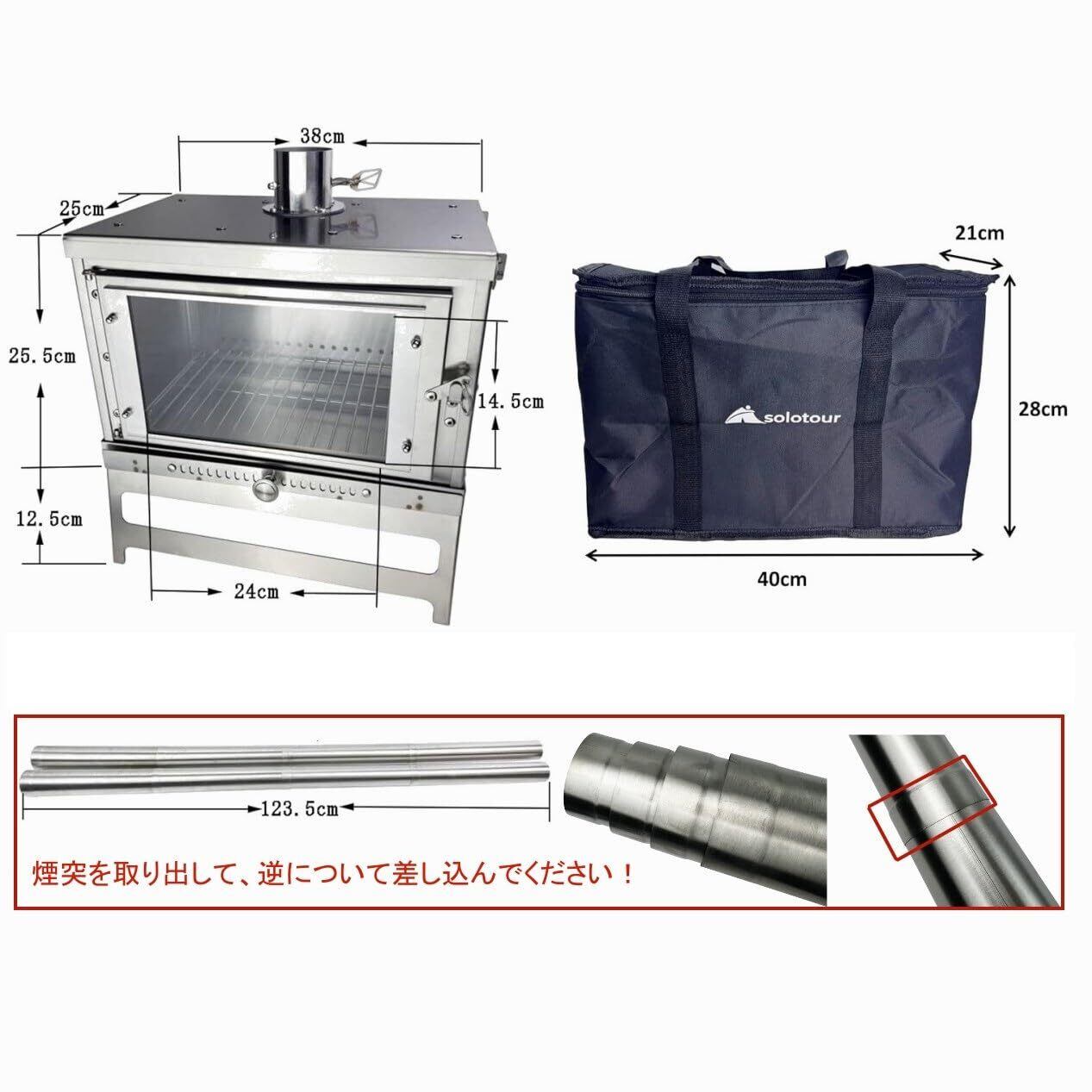 【人気商品】solotour 【二次燃焼】ガラス 薪ストーブ 組み立て コンパクト スパークアレスター ダンパー付煙突*収納バッグ付き サイズ 38*25*25