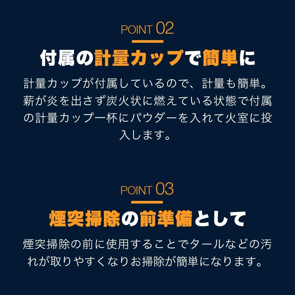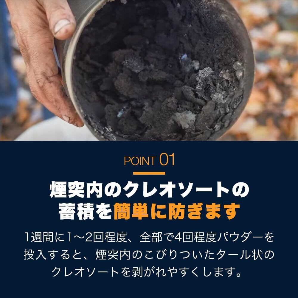 1週間に1〜2回程度、全部で4回程度パウダーを投入すると、煙突内のこびりついたタール状のクレオソートを剥がれやすくし、蓄積を防ぎます。