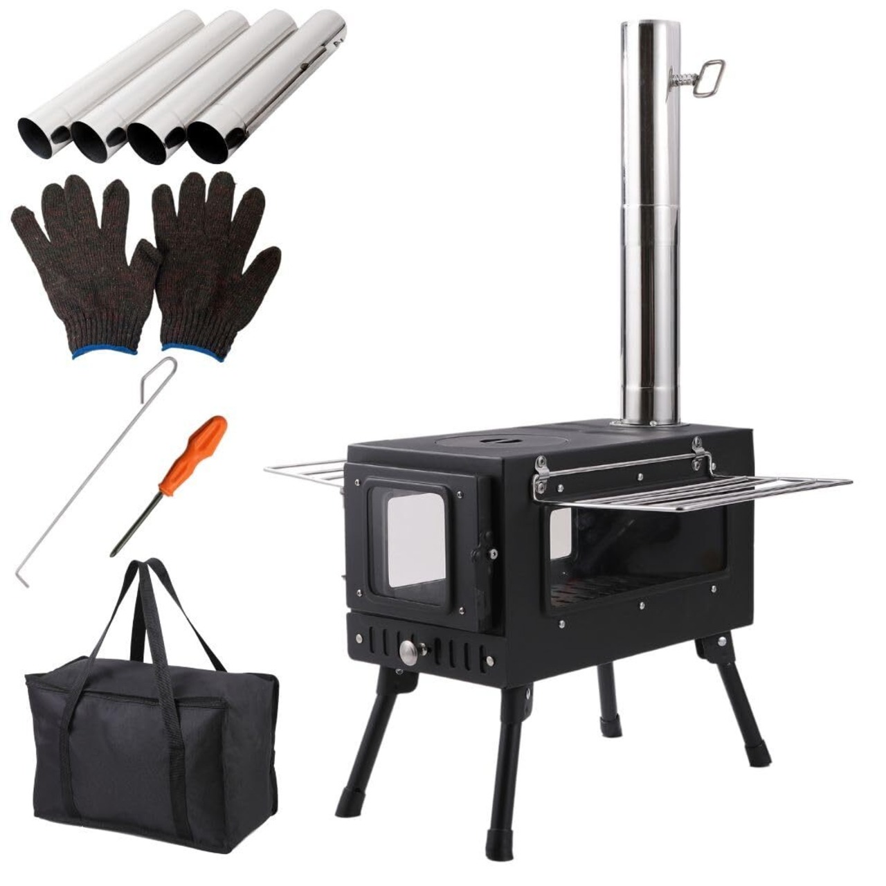 【新着商品】薪ストーブ 【キャンプ歴13年 キャンプインストラクター監修】 キャンプ まきストーブ キャンプストーブ 折りたたみ 煙突 調理 収納袋付き もち運びらくらく 煙突6本 ガラス面3面 2面 (3面)