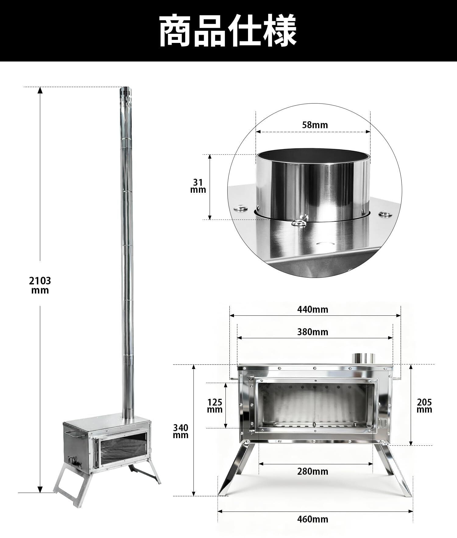 【商品仕様】●展開サイズ(約):W490mm × D205mm ×H 2103mm ●燃焼室サイズ(約):W375mm × D200mm × H170mm ●煙突パイプ:長さ329mm × 直径58mm(オス直径57mm、メス直径59mm) ●収納サイズ(約):W446mm × D225mm × H200mm ●重量(全煙突含め):8.25KG ●材質:ステンレス