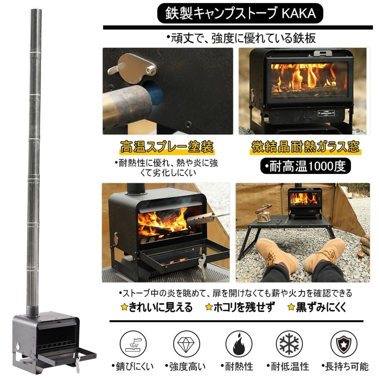 材質:本体は鉄を採用、高温スプレー塗装が施され、頑丈で強度高く、耐熱性に優れ、熱や炎に強くて劣化しにくく、耐久性に優れております。窓は微結晶耐熱ガラスを採用、熱に強く、何時までもきれいに見え、ホコリを残せず、黒くにくく、安全性を確保しつつ、ストーブ中の薪や火力を確認することもでき、扉を開けなくても火の管理や調節を手軽に行うことができます。