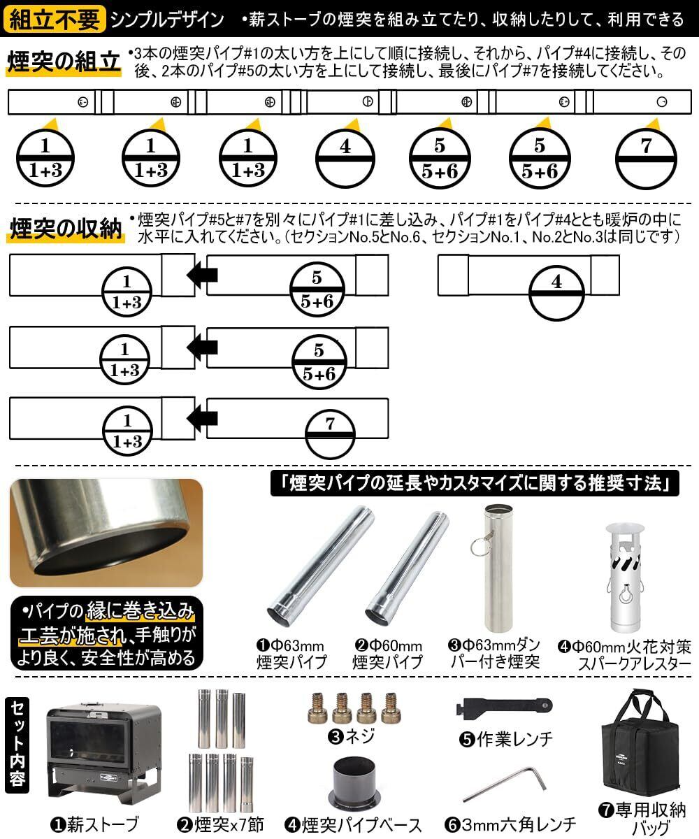 セット内容:薪ストーブ、煙突x7節、ネジ、煙突パイプベース、作業レンチ、3mm六角レンチ、灰かき棒となっております。(ご注意ください:使用した後、焼け跡が出るかもしれません、これは正常な現象であり、ご使用には影響しません。)