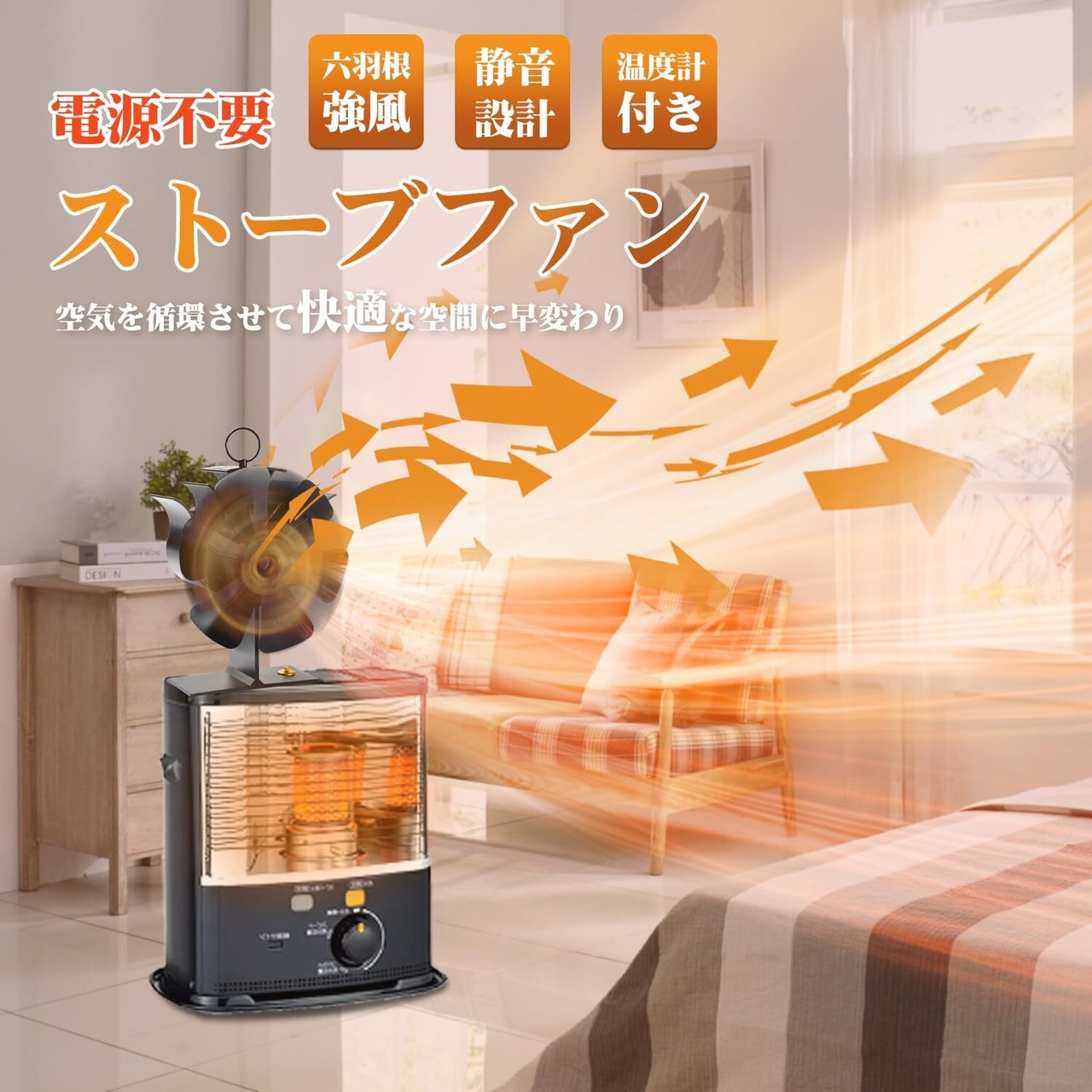 【2025最新】HUELLAS ストーブファン 一体型温度計 エコストーブファン 省エネ 静音6羽根 熱供給 火力熱炉 薪ストーブ 石油ストーブ ガスストーブ ペレットストーブ アルパカストーブ用 空気循環 暖房効率アップ シール 6つブレード 一つで二役 電源不要 温度計付き 日本扱説明書 (ブラック(6羽根))