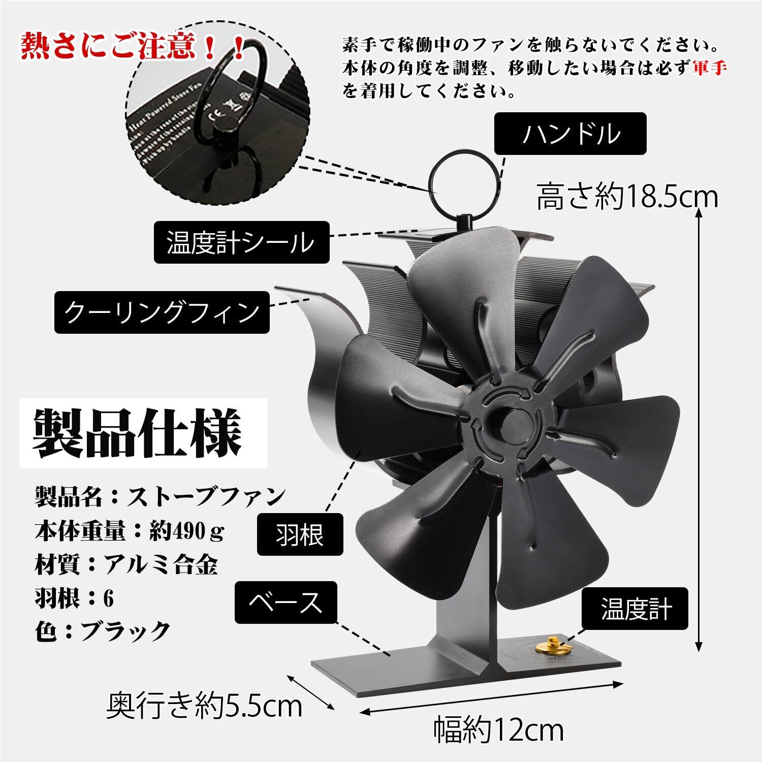 「製品仕様」: ストーブファン6羽根 ;サイズ(約):高さ18.5cm*幅12cm*奥行き5.5cm;重さ(約):本体490g;温度計シール付き温度計一体型。