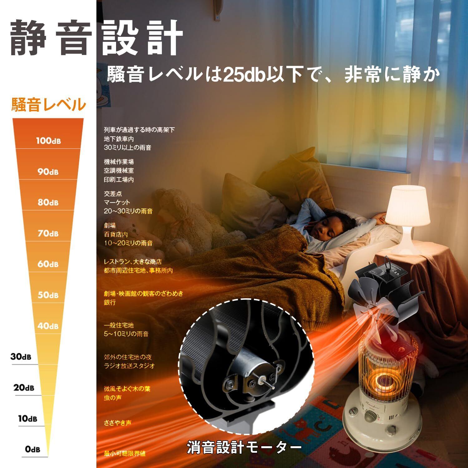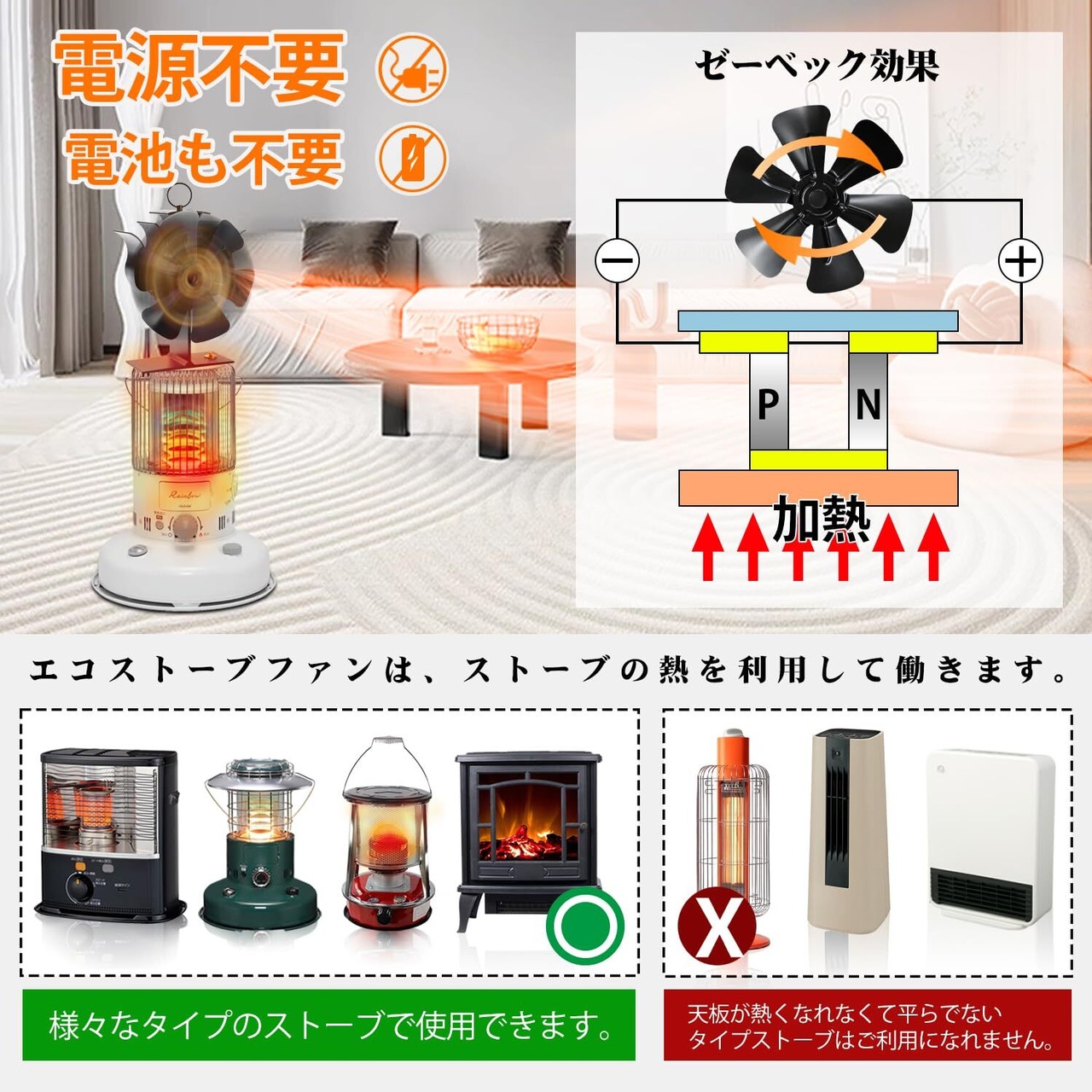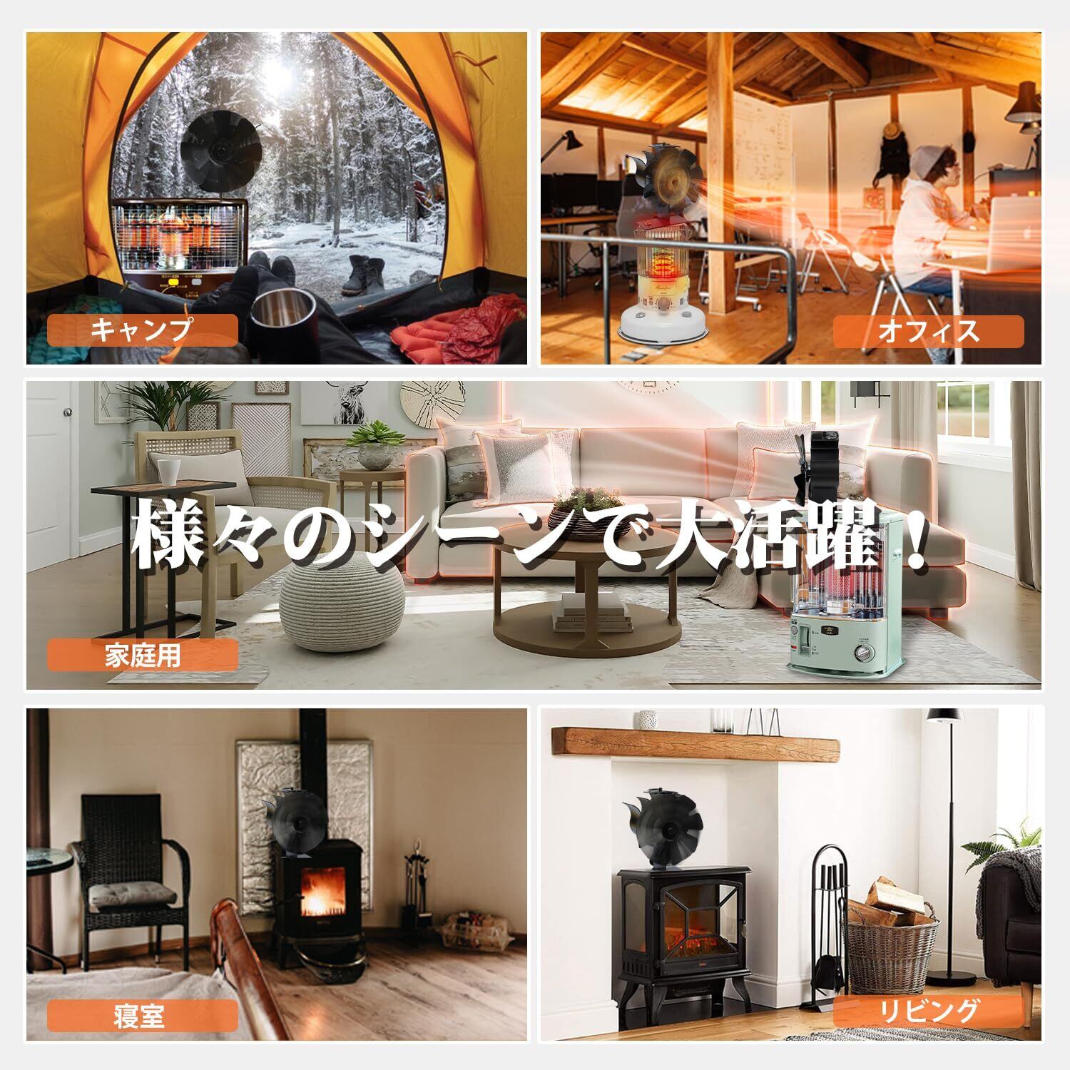 「新型・暖房効率アップ」:6羽根に進化しており、ストーブファンを使用することによって空気をよく循環させファンの進行方向から部屋全体に暖房効率をアップします。収納便利なデザインに設計され、キャンプする時、テント内でも熱気を回転する効果をエンジョイ出来ます。