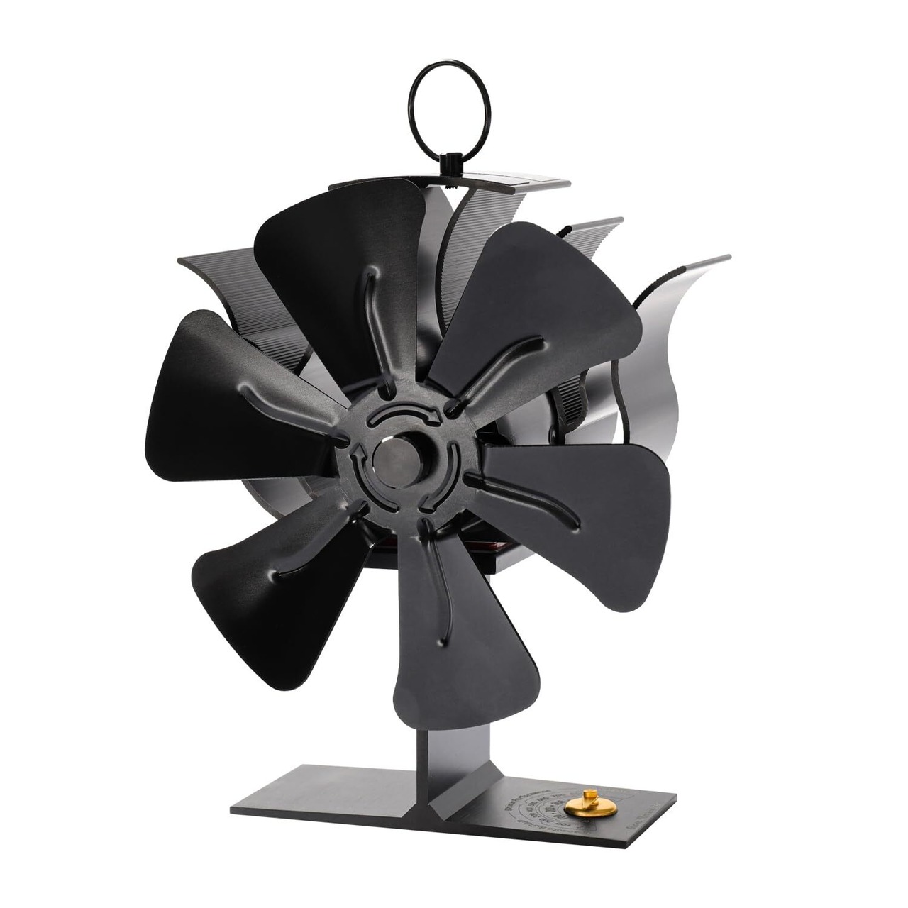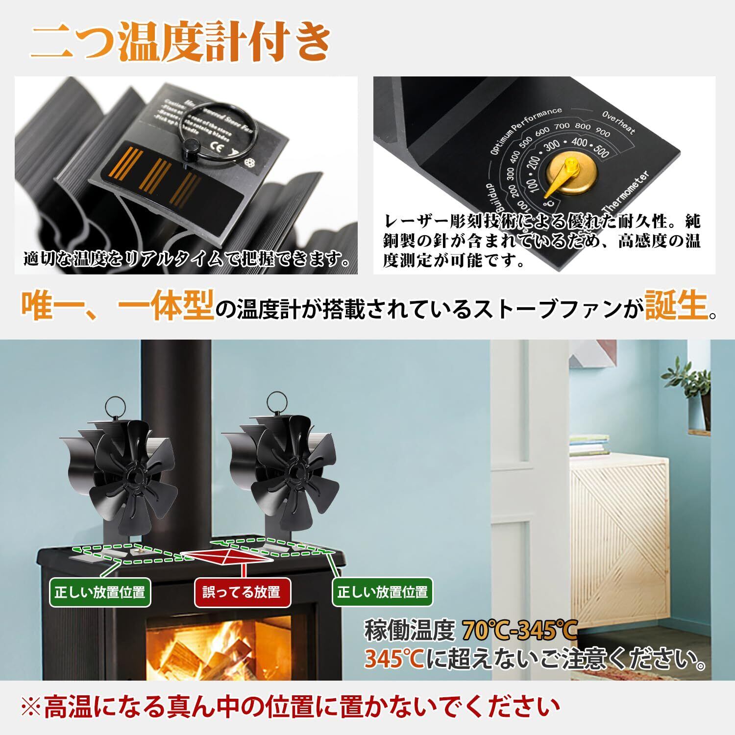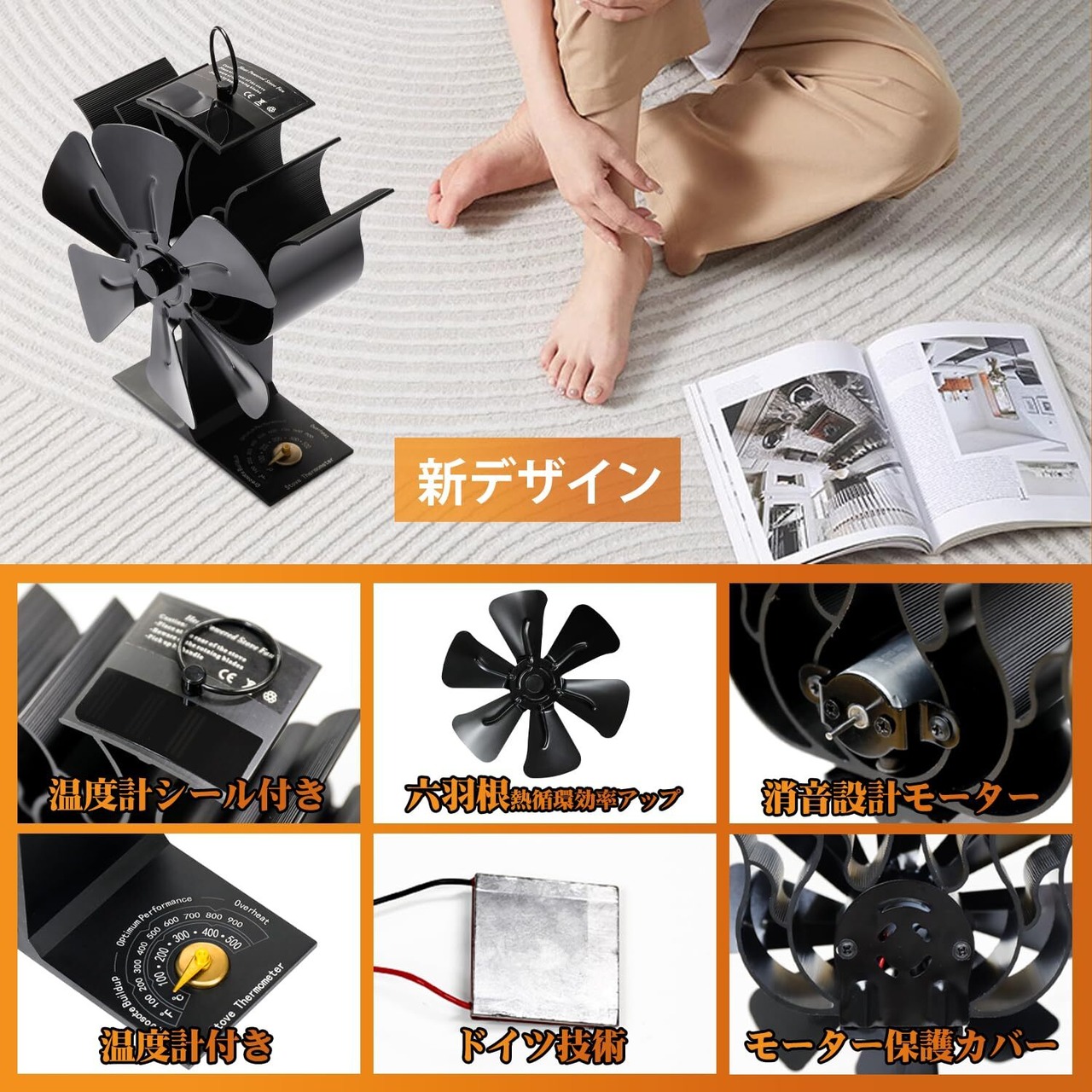 HUELLAS ストーブファン 一体型温度計 エコストーブファン 省エネ 静音6羽根 熱供給 火力熱炉 薪ストーブ 石油ストーブ ガスストーブ ペレットストーブ アルパカストーブ用 空気循環 暖房効率アップ シール 6つブレード 一つで二役 電源不要 温度計付き 日本扱説明書 (ブラック(6羽根))