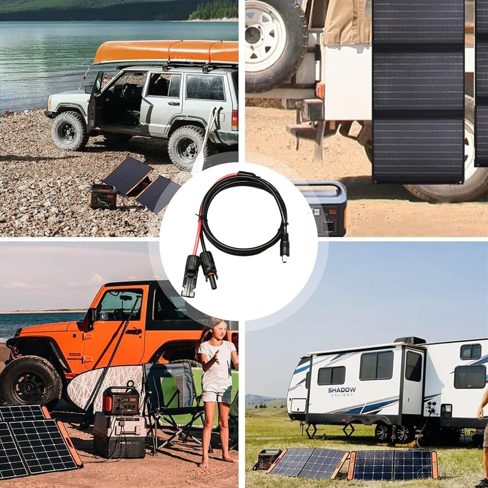 【仕様】規格:本線は頑丈な16AWG銅線、支線は14AWG銅線、長さ:1M、電圧: 300V、温度範囲:-40℃ ~ +80℃。防水レベルはIP67に達します。水や粉塵などがソーラー充電ケーブル内部に侵入しないことを確保できます