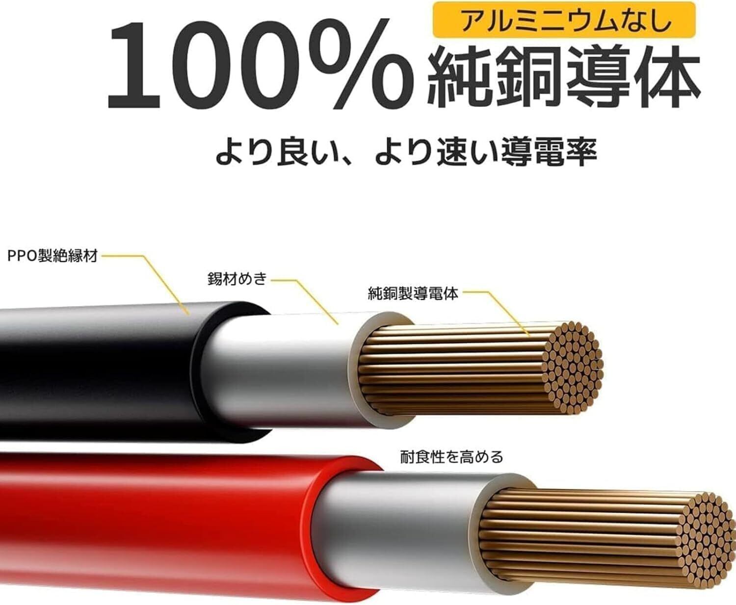 【高品質 - 純銅製導電体】内蔵導体は頑丈な純銅材質を採用し、耐食性と柔軟性を備え、同時に導電率を高めた。銅線の外部には錫めっき技術を採用し、酸化による導電率の低下を効果的に防止している。