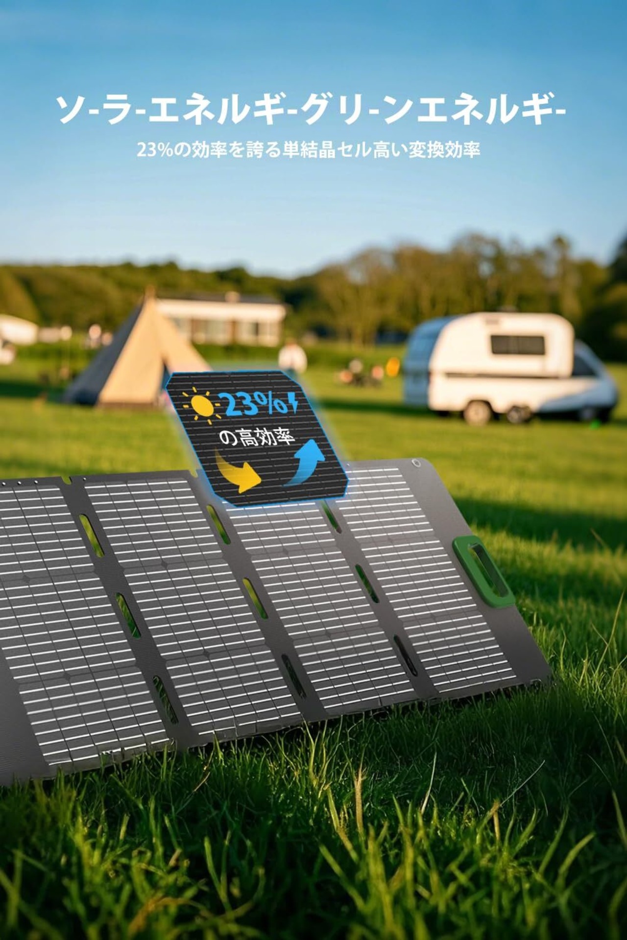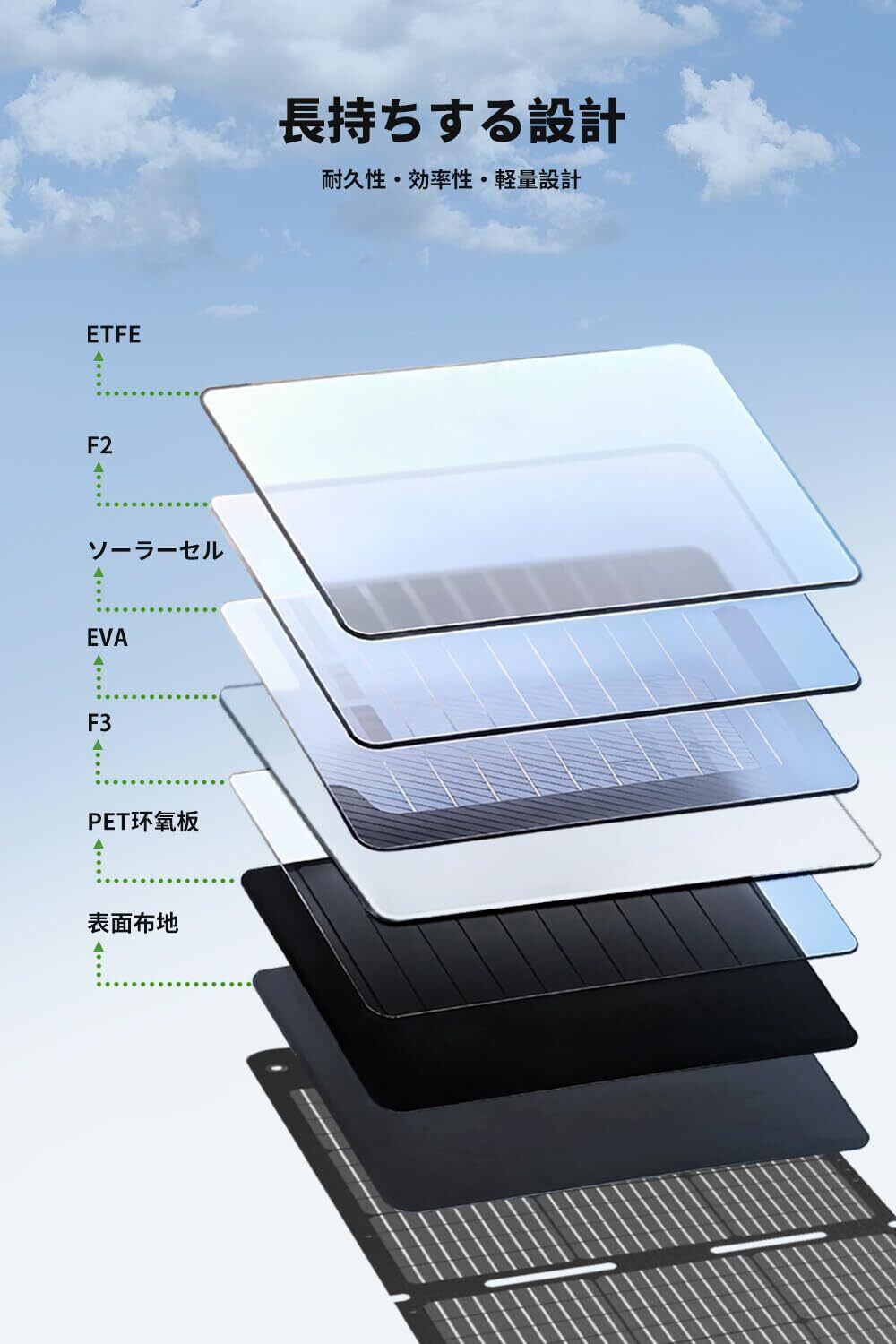 Loncinのソーラーパネルは、高効率な単結晶シリコンを使用し、最大100Wの発電が可能です。また、表面には日本製のETFEコーティングが施されて、透過率が非常に高いため、変換効率は23%に達します。パネルが部分的に遮られても、安定した出力を維持できます。さらに、環境に優しい素材を使用しているため、リサイクル時の負担も少なく、持続可能な製品としてご利用いただけます。