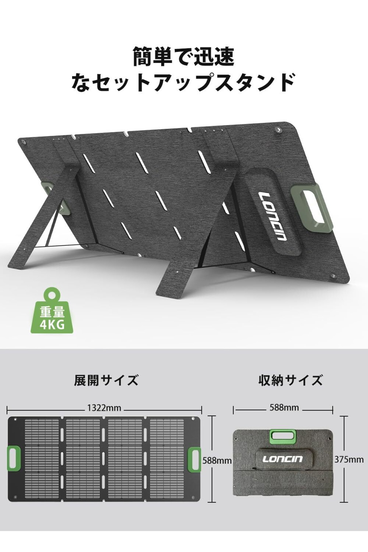 先進の軽量一体成型ラミネート素材を採用しており、100Wソーラーパネルはわずか4kgと、従来の製品に比べて20-40%も軽量です。展開時のサイズは、1320×588×30mmと、用途に応じて選べるサイズ感があります。一方、収納時のサイズは588×375×45mmとコンパクトにまとめられます。また、持ち運びやすいハンドルが付いているため、キャンプやハイキングなどのアウトドア活動にぴったりです。地震や停電などの緊急時には家庭用のバックアップ電源としても便利に収納でき、エコなライフスタイルに欠かせない存在です。