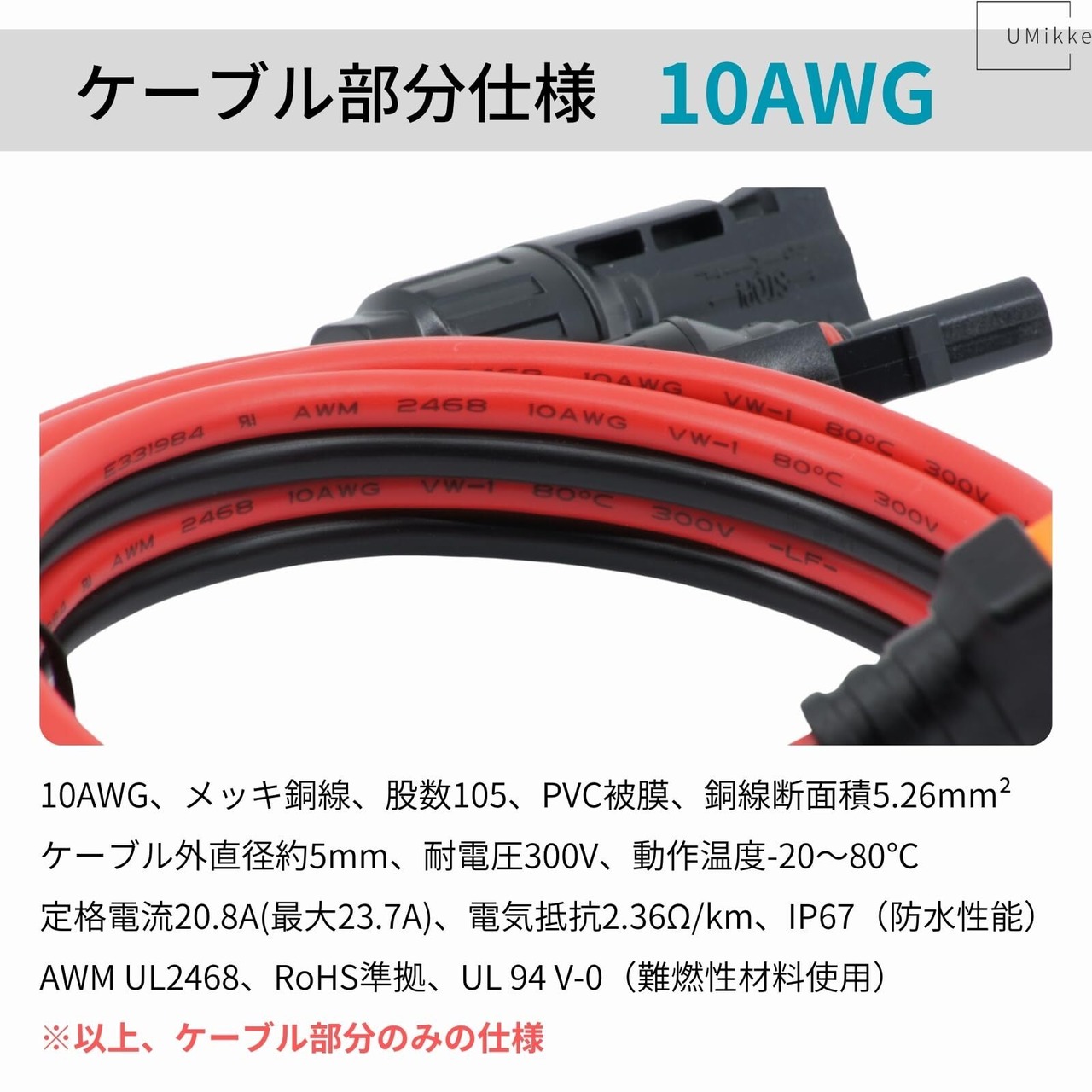 【12AWG・10AWG共通仕様】防水性能:IP67以上(MC4コネクタ部分はIP68)、耐電圧:300V、動作温度:-20℃~80℃、防火性能:UL 94 V-0(難燃性材料使用)