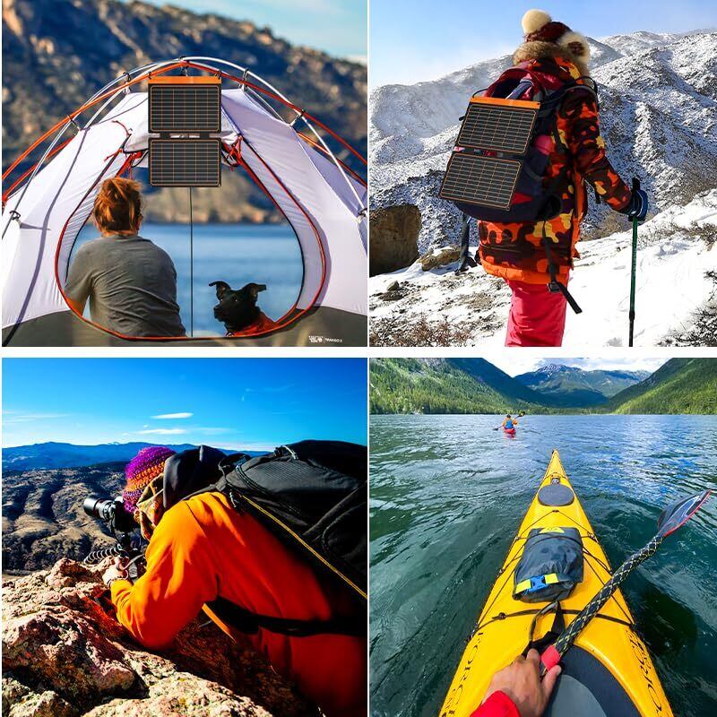 【折りたたみ&軽量】折りたたみ可能なデザイン(折りたたみサイズ:304*248*15mm、展開サイズ:462*304*14mm)で、iPad Pro 2021バージョンの12.9インチとほぼ同じです。 わずか1.5ポンド(700g)の軽量で、2つの金属製カラビナを含むバックパックまたはトラベルバッグに簡単に掛けます。20Wポータブルソーラー充電器は、キャンプ、ライディング、クライミング、ロッククライミング、アウトドアに適しています。