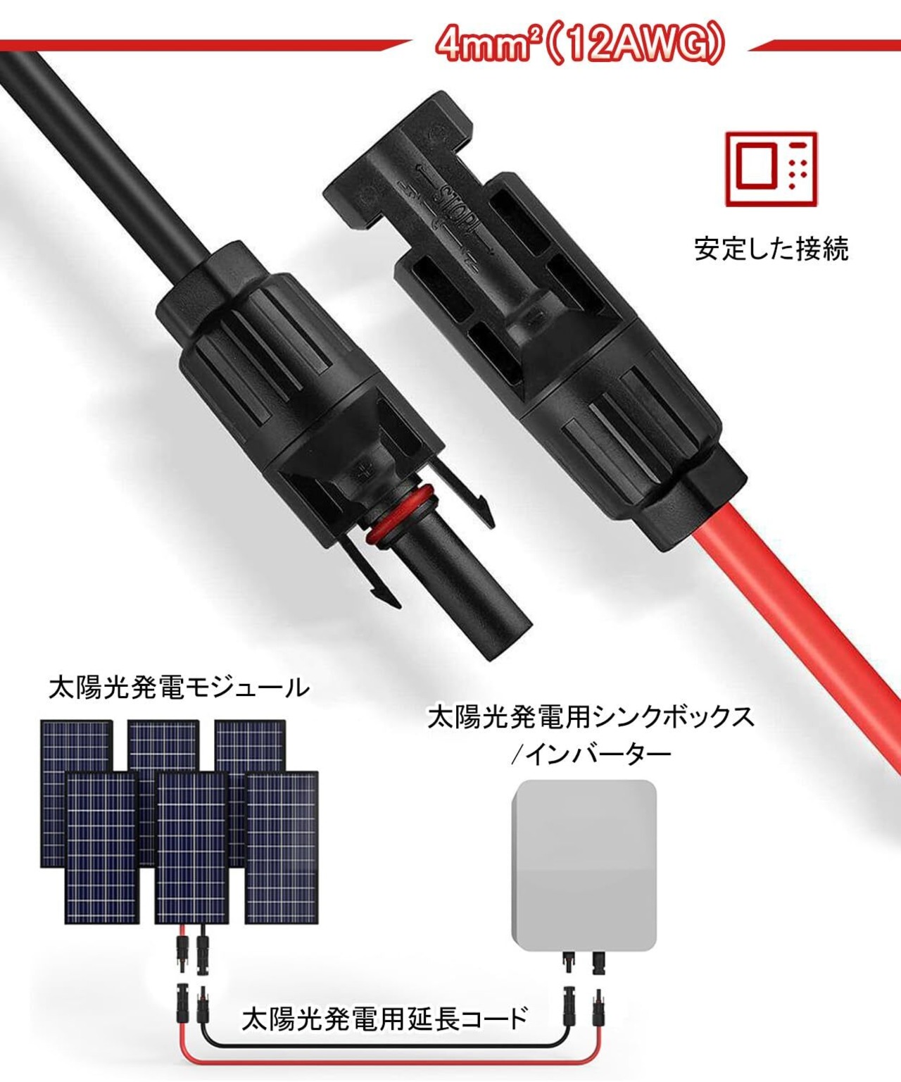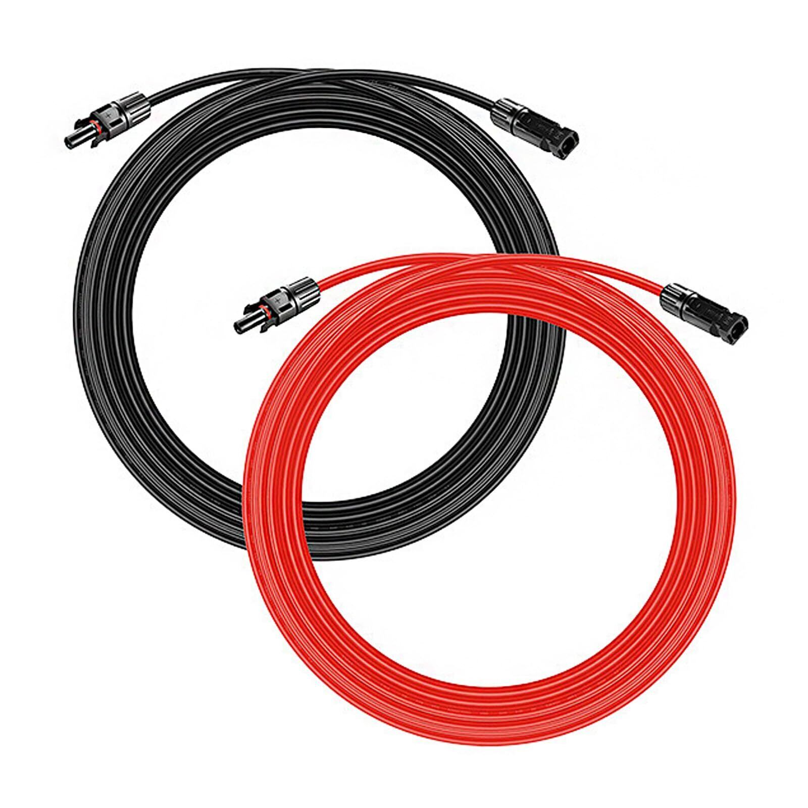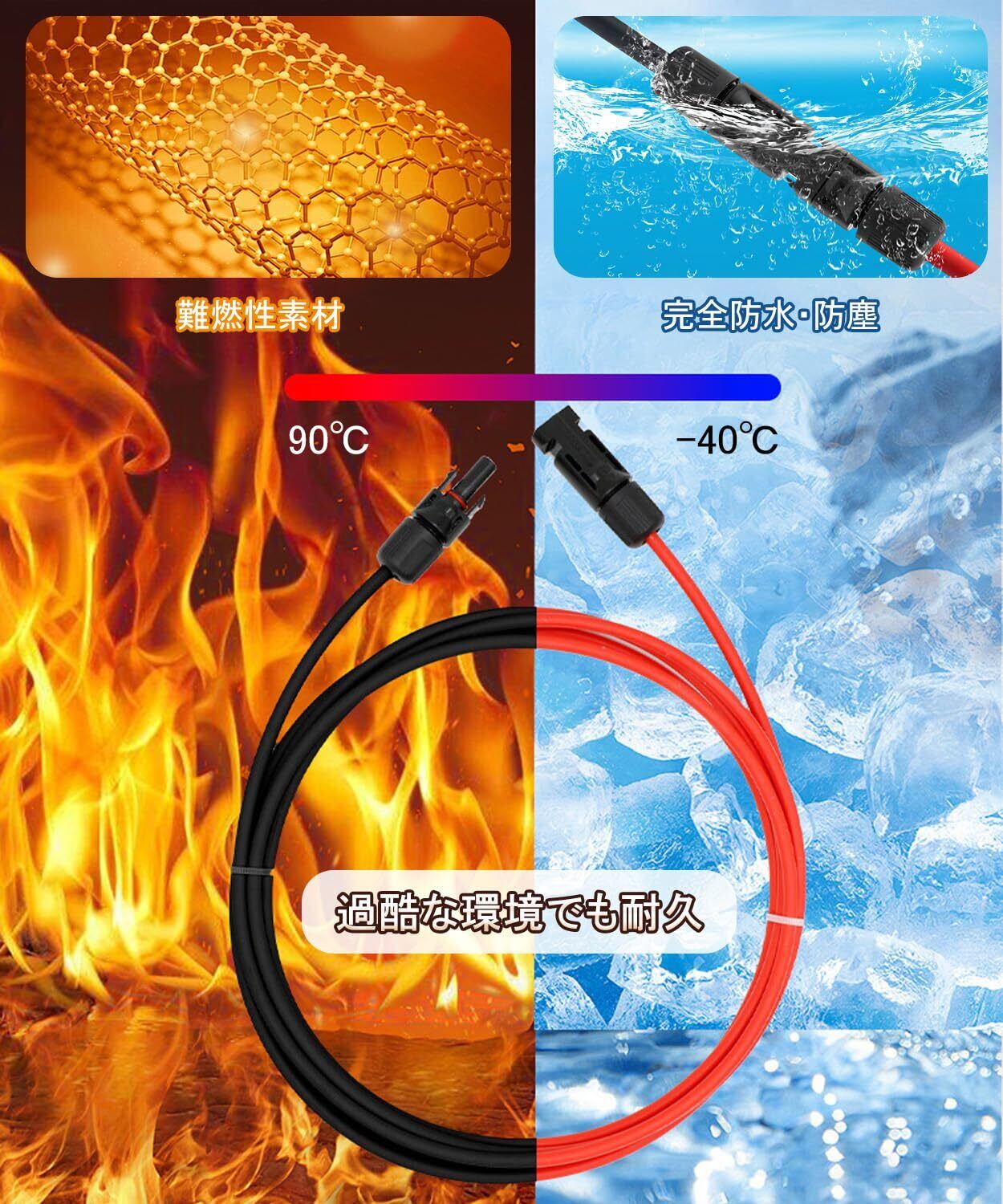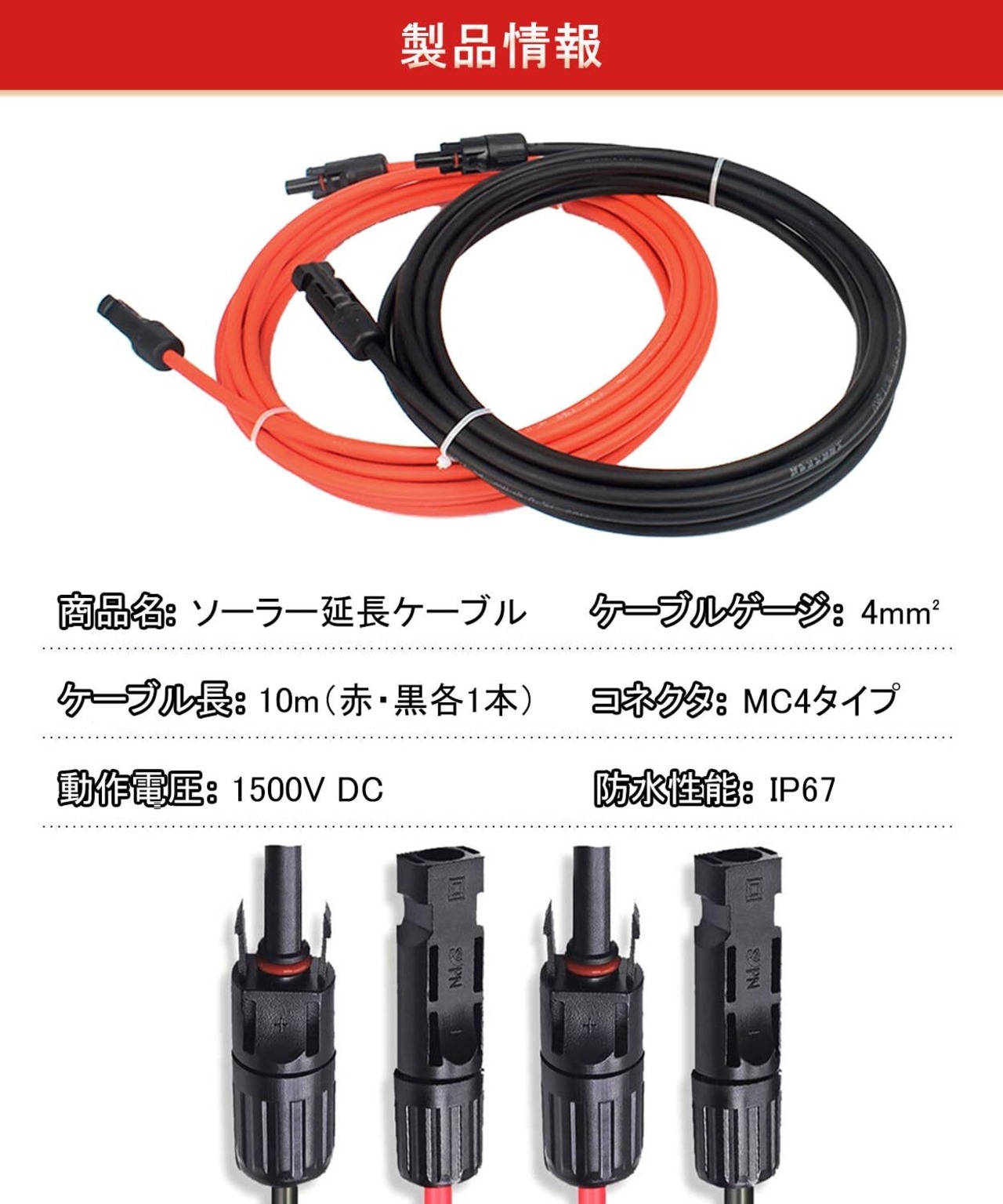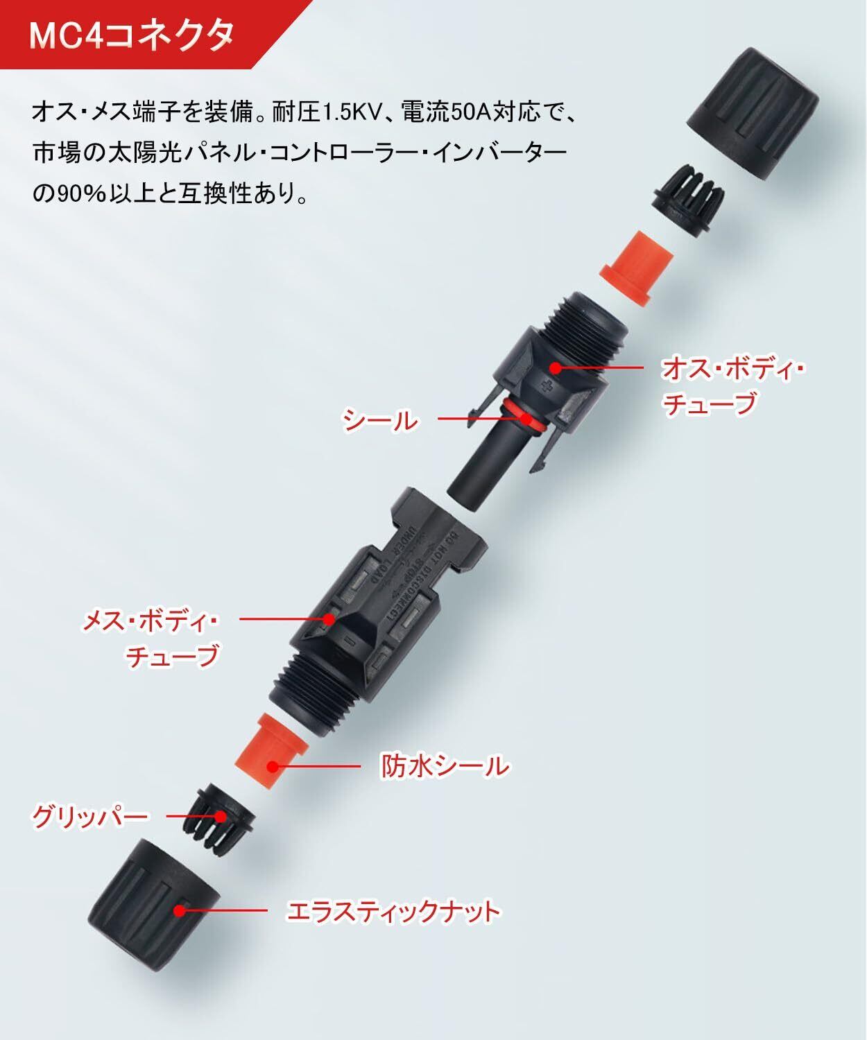 【簡単接続】MC4コネクタ(オス・メス端子)を装備。耐圧1.5KV、電流50A対応で、市場の太陽光パネル・コントローラー・インバーターの90%以上と互換性あり。10m×2本(赤・黒)セットで、太陽光アレイのレイアウト拡張が容易。面倒なケーブル切断や接続作業が不要で!