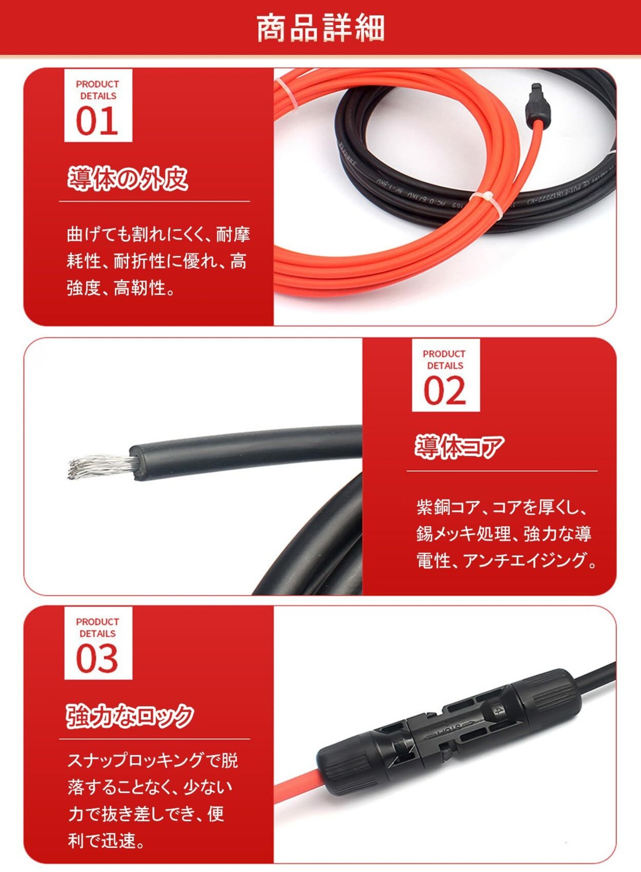 【太陽光システムの効率アップ】太陽光発電のために最適化された設計! 低抵抗構造でエネルギー損失を抑え、システム全体の発電効率を5~10%向上。以下の用途に最適: 家庭用屋根設置型太陽光発電 ソーラー街路灯・庭園灯の配線 キャンピングカー・オフグリッド電源 農業用灌漑・監視カメラの電力拡張 小規模家庭用から商業用発電所まで、コストパフォーマンスに優れた電力伝送ソリューションです!