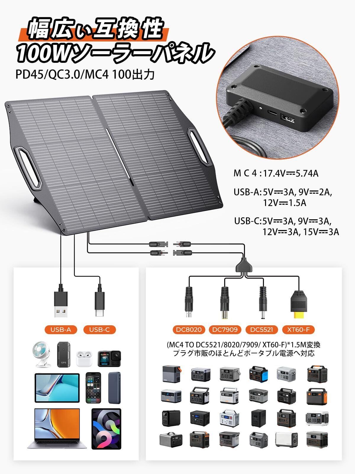 【MC4 100W&PD45W高出力&QC3.0で急速充電】MC41to DC5521・DC8020・DC7909・XT60-F変換ケーブルを搭載し、 ソーラーパネルは市販の大部分のポータブル電源に対応できます。そして、USB-A*1(QC3.0出力:5V3A-9V2A-12V1.5A)USB-C *1(PD45W高出力:5V3A-9V3A-12V3A-15V3A)のポートを搭載しており、スマホ、タブレット、PC、モバイルバッテリー、ポータブル電源など幅広い機器の充電に対応できます。同時充電可能で地震などの災害の時は役に立ちます。